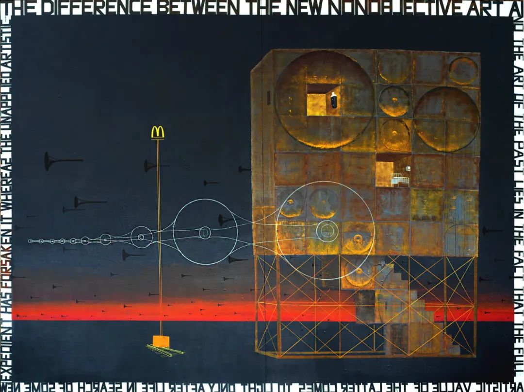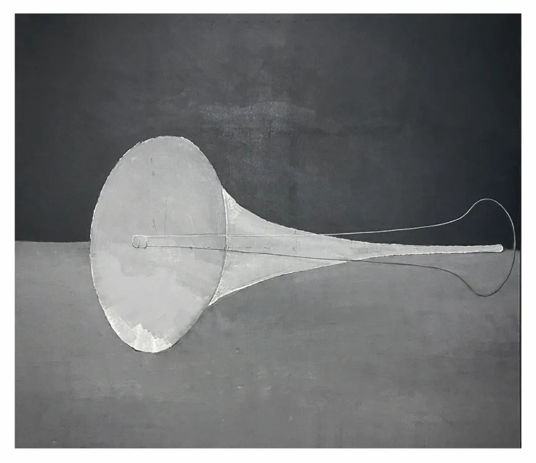 “向后看”是对历史的深刻的反思与凝望。何工以喇叭作为符号,以声音作为隐喻展开了一场持续多年的声音考古学实践。所谓“声音考古学”,毫无疑问在概念上受到了米歇尔·福科的《知识考古学》的启发。与文本的论述不同,何工的声音考古学是通过复杂的图像的关系来揭示“声音”话语的复杂性,即不仅是政治话语,还有知识话语及其它。从去年开始,他对喇叭的形象的处理呈现出一些新的变化:喇叭被处理为简洁的几何形,复杂的图像关系被简化,绘画中的肌理被磨平。这些变化提示着,喇叭及其象征的话语与绝对的而冷峻的形式具有内在的一致性。