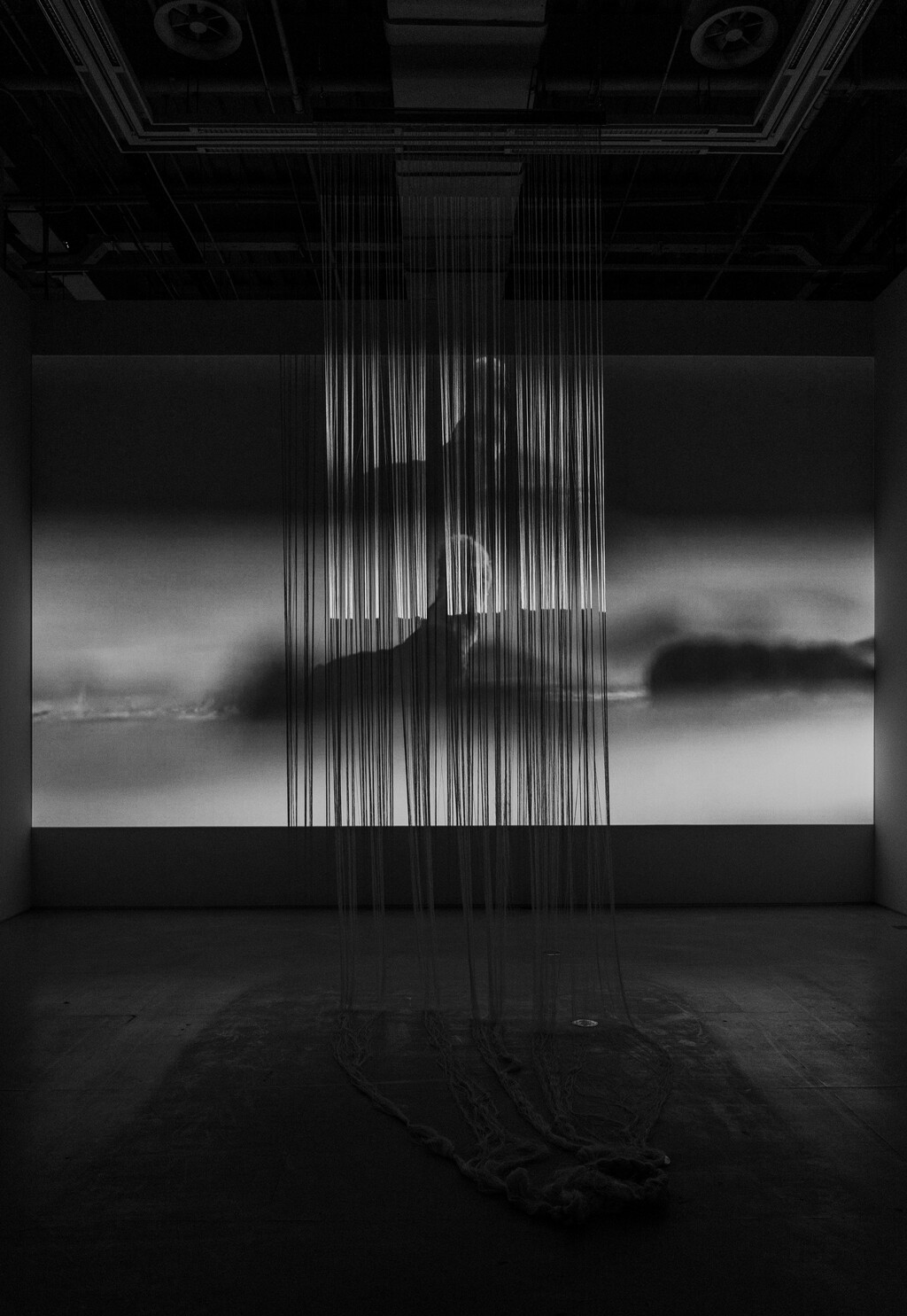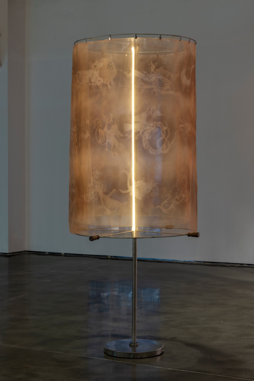 岳明月x景军《以身转生》,2025,纱,丝线,不锈钢,灯管,80×80×200cm。“将死亡带回生活”展览现场,MACA,2025。摄影:杨灏
