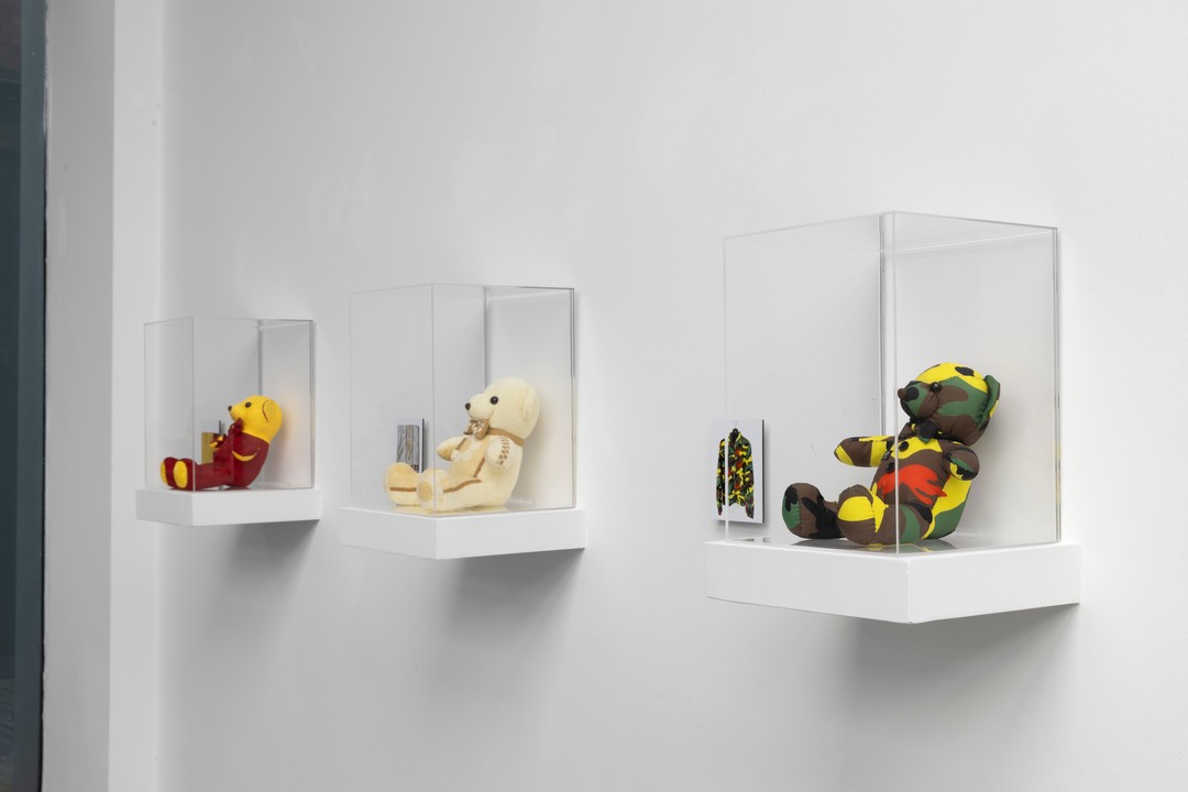 向芷霖,《思念熊》,2020-2025,丧亲者衣物,布料,摄影30×30cm×6组。“将死亡带回生活”展览现场,MACA,2025。摄影:杨灏 (2)