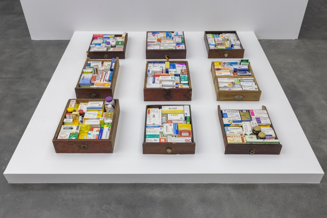 景军×周雯静,《给自己开药方》,2025,装置,抽屉,常用药盒, 600×600cm。“将死亡带回生活”展览现场,MACA,2025。摄影:杨灏