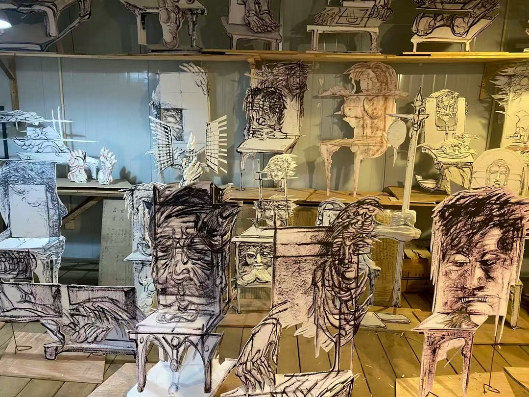 此次成都站展览中,川渝地区艺术家与首次加入的艺术家及学者的参与,为展览注入了新的能量,并拓展了展览的在地性与多元视角。朱成以宋代墓室石刻“虚位以待”的灵位空椅为原型,创作出上百把光怪陆离的椅子;朱明通过地震遗址回收的预制板,反思生命的脆弱与社会责任。赵欢、贺鹏、刘丽娟与徐鑫桦则聚焦宠物离去、动物视角、生物与人类的脆弱性,以及松树枯死中的自然法则。四川美术学院的李敏敏教授与景军教授团队,举办过三届以关爱老年人为主题的高校公益海报设计大赛,他们的共同研究《刻板印象》探讨图像如何反映我们对老年形象的认知。在展览现场文献区,儿童与成人被邀请在搭建与游戏中讨论老年视觉形象。