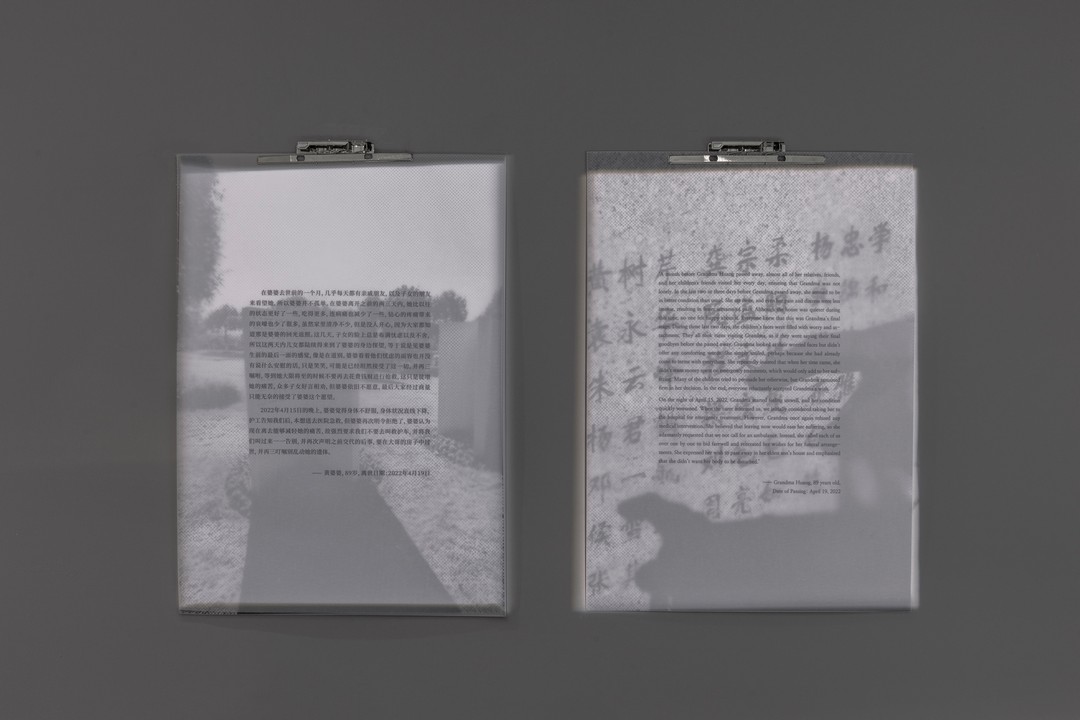 “将死亡带回生活”(Bringing Death Back into Life)的概念源自《柳叶刀》死亡价值学术委员会于2022年发布的同名报告。该报告呼吁重新思考临终关怀与社会对死亡的态度,强调临终时光应被视作生命的一部分。在现代医疗体系中,药物和医学设备深刻塑造了身体的生存方式。然而,正如莎伦·考夫曼(Sharon R. Kaufman)在《生死有时》中所描绘的,医疗空间充满矛盾:一方面延续生命,另一方面却重塑死亡的面貌。尊严死是否可能实现?艺术家周雯静、张沐辰、路桂军、宋敏、郑确与向芷琳的作品,从这些视角出发,聚焦抗生素、疾病告知、医疗决策、临终反向关怀与情感追思,回应医疗体制下个体权利与尊严的问题。而朱鑫、应歆珣、莫倪健、向帆、云峰则从个人经验出发,分享追忆、怀念与练习接纳死亡的方式。