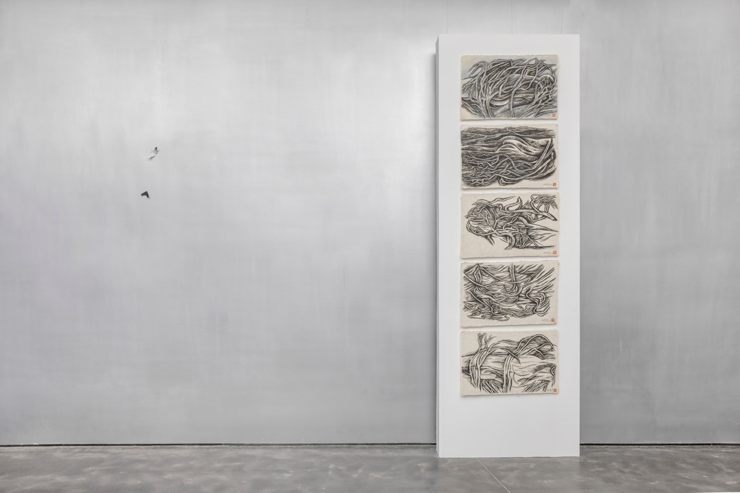 林乐成,《塔克拉玛干·生命系列》,2025,绘画,82×53cm×5幅.“将死亡带回生活”展览现场,MACA,2025。摄影:杨灏