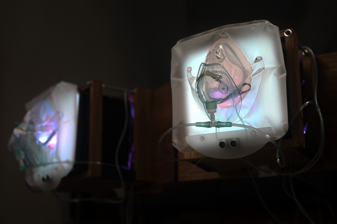 张沐辰,《呼吸》,2014—2025,装置,木材,TPU气囊,皮腔,氧气面罩,电机,200×200×160cm