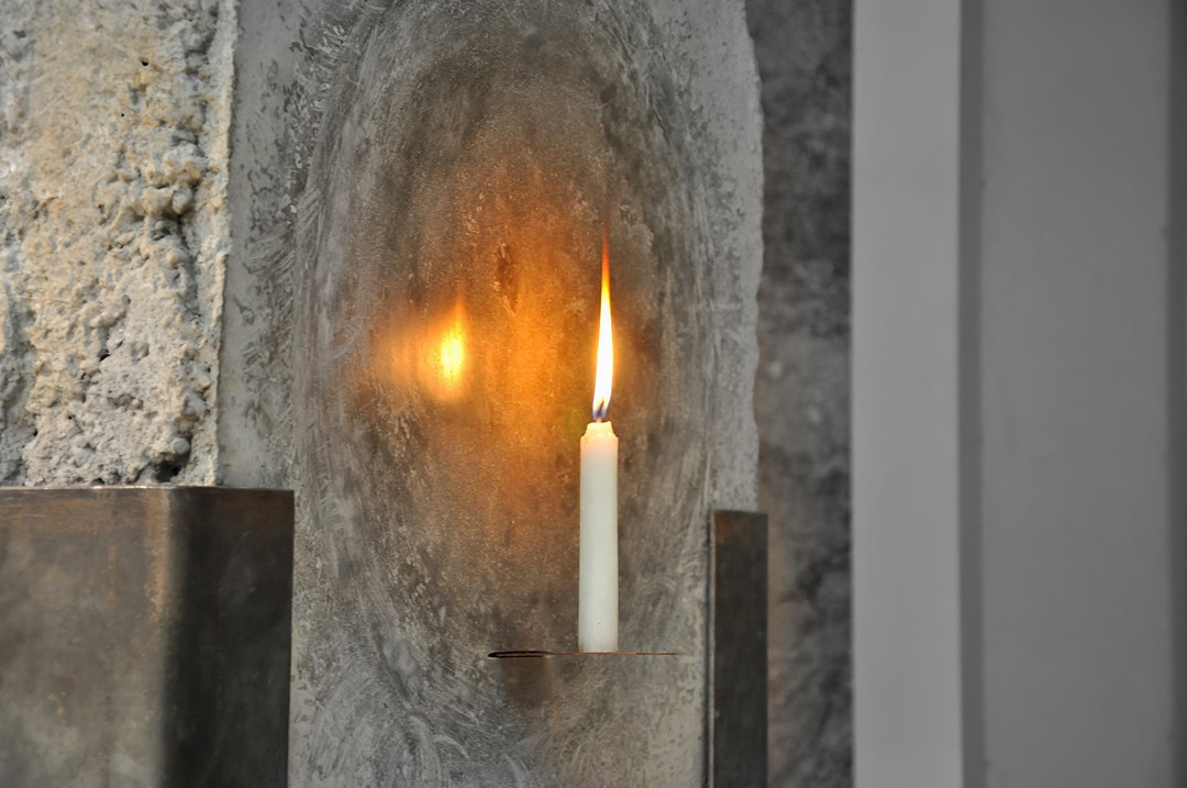 朱明,《预制·鉴》,2011,预制板(汉旺地震遗址)、蜡烛、钢,60cm×86cm×176cm