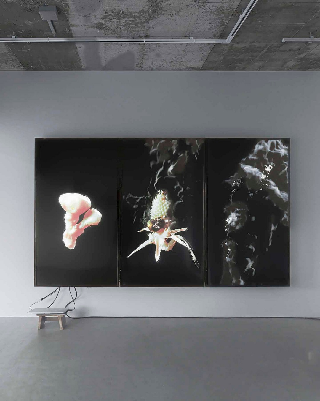 郑确,《错位》,2024,影像装置,记忆海绵,蜡,亚克力,屏幕,尺寸可变.“将死亡带回生活”展览现场,MACA,2025。摄影:杨灏