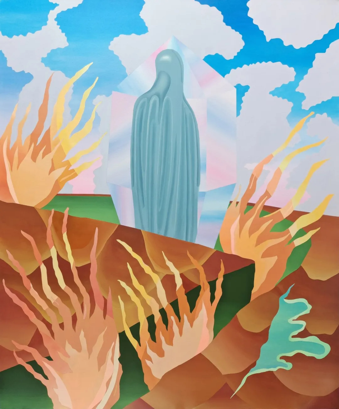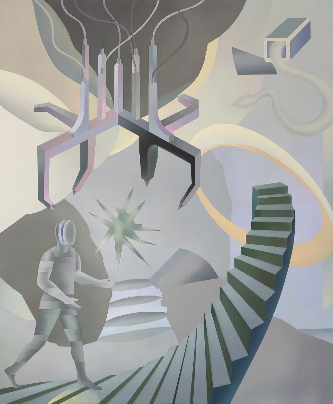 再次,在空间建构上,苏福成的作品呈现出鲜明的数字时代特征。与达利等传统超现实主义的荒诞叙事不同,其作品创造的是“数字时代的超现实”,核心在于现实与虚拟的空间折叠,而非纯粹的梦境想象。他摒弃了传统透视法,转而采用多视角叠加的空间逻辑,使日常空间的平视、数码模型的俯视与虚拟界面的第一人称视角共存于同一画面,形成类似元宇宙的混合场域。这种空间建构是其“漫游者”身份的视觉投射。他不固守于现实或虚拟的某一端,而是主动居于两者之间的交界地带。例如在《随机降临》中,楼梯的现实属性与数码云朵的虚拟属性彼此消融,形成一个难以被归类为现实或虚拟的“第三空间”。而那些在冷色与暖色之间渐变的过渡地带,更以视觉方式摹拟出我们在这个时代中所体验到的边界模糊感。