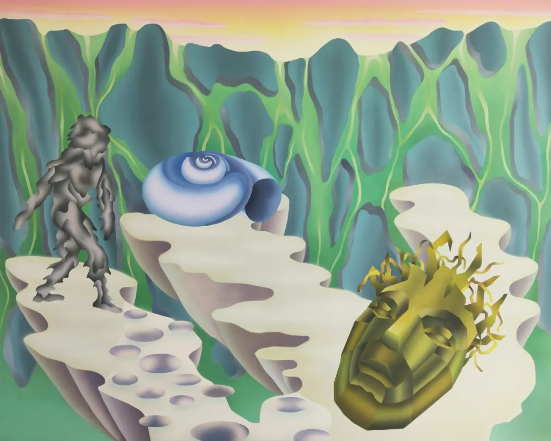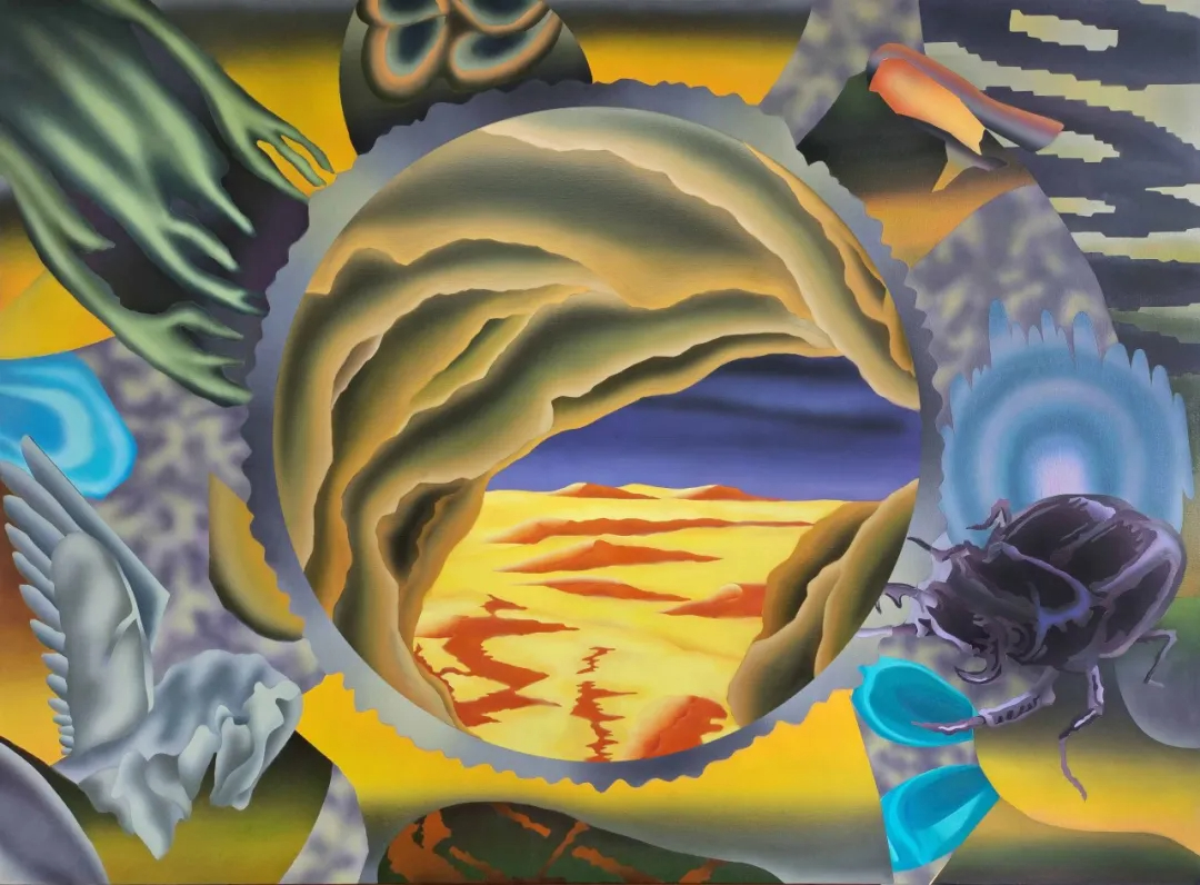 其次,苏福成的作品有着明确的图像性逻辑,且在其创作过程中似乎遵循着某种独特的“数字时代视觉语法”。在他的画面中,高度几何化的数码模型符号与充满偶然性的日常图像并置共生。前者如简化的建筑线条、像素轮廓或虚拟模块,传递出理性与秩序;后者则如一只机械手臂、一张面具、一只蜗牛,或一片风景碎片,携带着生活的随机与温度。这种拼构不仅打破了传统绘画的时空统一性,也成为对数字认知方式的视觉转译。在《边缘漫游者》《不稳定隧穿》《表面边界》等作品中,虚拟建筑与现实的山川、动物、植被等景观相互渗透;《缺失的环节》《拟态生成器》《嵌入结构》等则通过数码时空模型与日常褶皱的并置,以时空的无限感与几何模块的有限性形成反差,暗喻数字时代人们“困于现实,心向虚拟”的生存状态。这种图像逻辑并非无意义的碎片堆砌,而是对数字时代认知方式的镜像呈现。