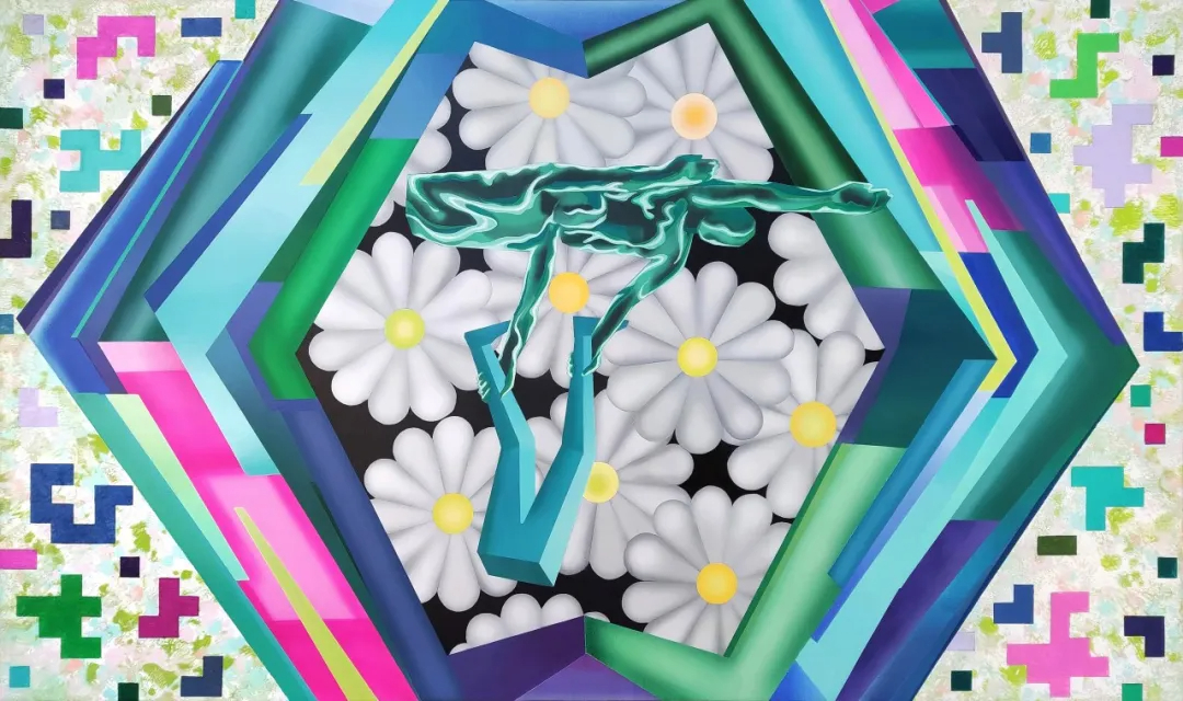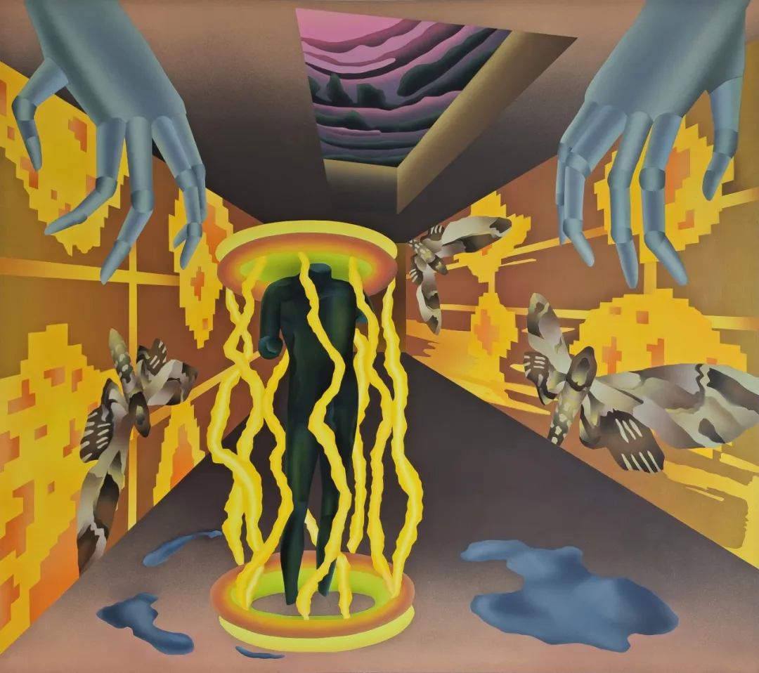 因此,在我看来,苏福成的创作作为一个个体样本,在当代绘画的语境中具有多方面的价值意义。他不仅在拓展绘画的媒介边界,使丙烯与综合材料成为回应数字现实的有效载体;也在重构图像的叙事逻辑,以拼构与并置贴近当代人的感知方式;更通过超现实的空间与色彩处理,将数字时代的生存体验转化为可感可知的艺术形态。当然,此类探索亦存在值得商榷之处。一方面,碎片化拼构若处理不当,容易滑向图像堆砌的陷阱;另一方面,过度依赖数码模型符号可能削弱绘画的手工性魅力。真正的挑战在于,如何在表现数字感的同时,保留绘画行为本身所赋予作品的独特温度与生命,更在于艺术家通过手工赋予作品的独一性。若符号化、模式化的表达成为主流,或将导致作品失去其灵韵。然而,苏福成的实践无疑具有前瞻性。他没有回避数字技术为绘画带来的冲击,而是主动迎向这场变革,以创作证明:绘画并未因技术的迭代而衰微,反而能在与数字文化的对话中,拓展出新的表达维度。