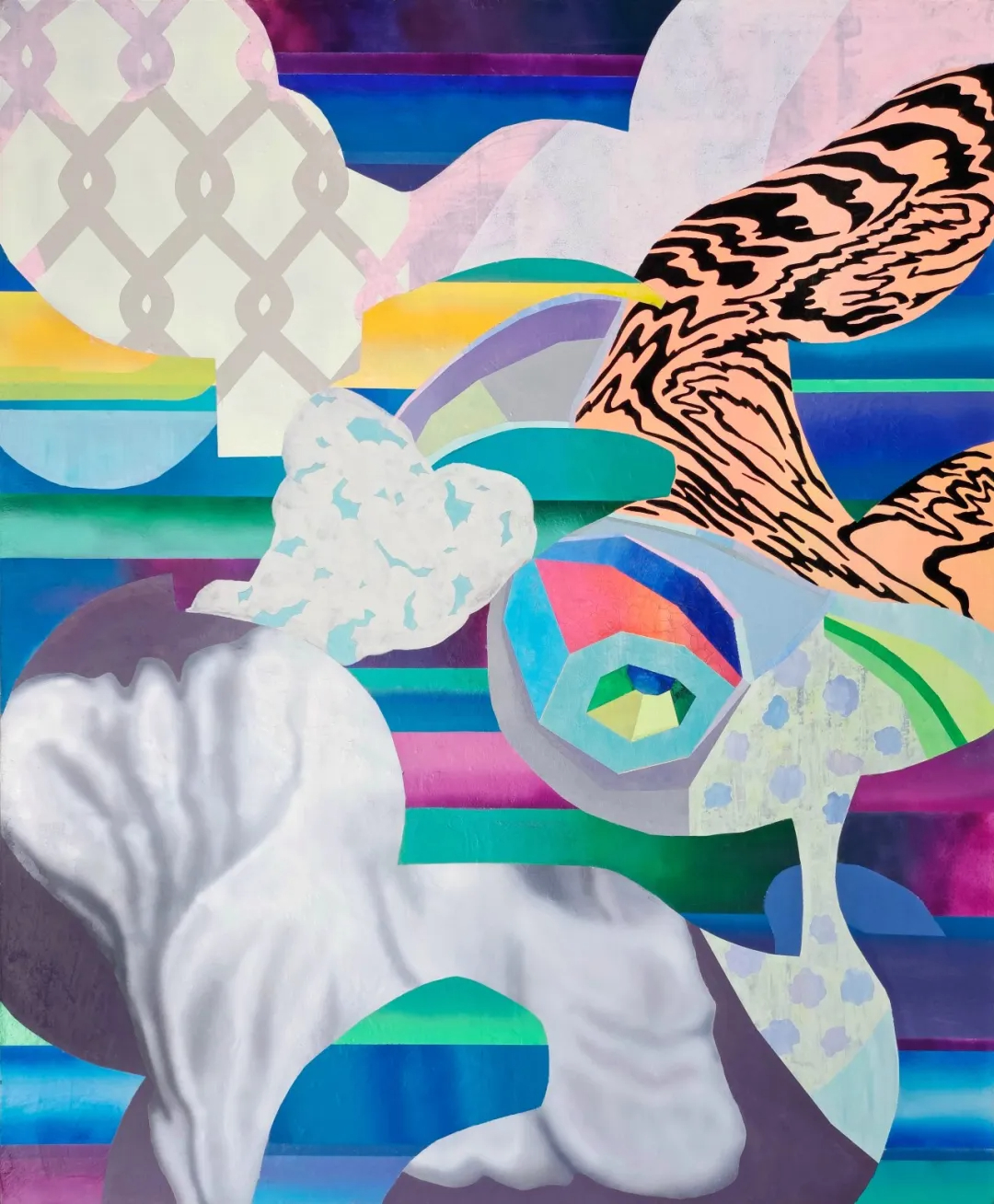 最后,色彩在苏福成的作品中承担着重要的表达功能。艺术家偏好高饱和度的色彩组合:数码模型符号多以科技感的靛蓝、荧光橙、粉紫、冷白为主,唤起观者对电子屏幕、虚拟游戏的视觉记忆;日常碎片图像则常以暖橙、米黄、浅棕等生活化色彩呈现,传递现实生活的温度感。两种色彩体系的碰撞与融合,构成画面的情感节奏,唤起观者对虚拟疏离与现实亲切的双重感知。特别值得注意的是色彩之间的过渡处理。苏福成借助丙烯的层叠晕染,在冷色与暖色之间营造出模糊的“色彩过渡带”。从数码蓝到日常橙的渐变过程中出现的浅紫、粉橙等中间色调,成为现实–虚拟边界的视觉隐喻。这些过渡色既不属于冷调的虚拟,也不属于暖调的现实,而是两者有机联结的纽带。这种处理方式与艺术家的创作视角高度一致,聚焦于现实与虚拟的交融地带,细腻地捕捉数字时代的情感复杂性。