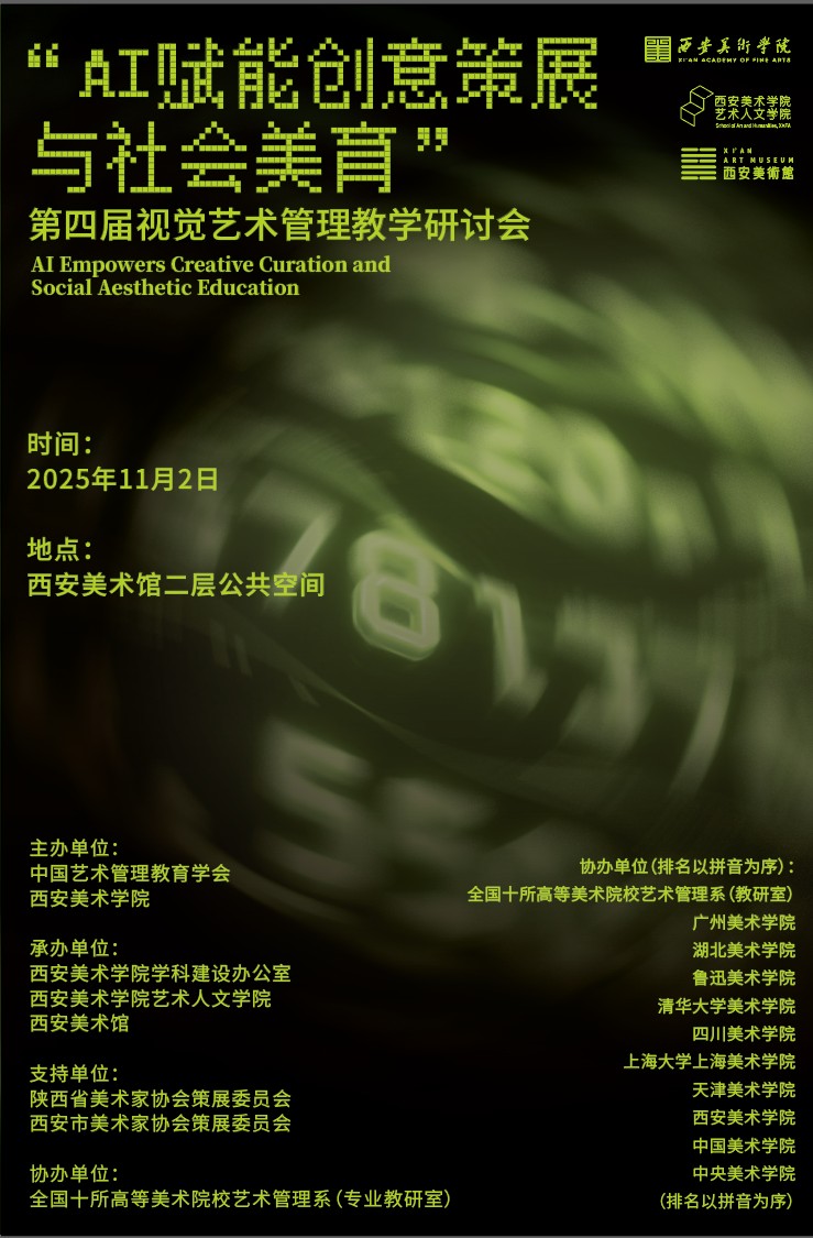 第二届“解构·重塑·赋魅”青年策展人主题联展的总主题是“生成之间”,旨在探索AI深度介入艺术展览策划实践的经验,构筑起人类审美感知与AI技术逻辑之间充满张力的创意空间。青年策展人作为当代文化创新建构的重要推动者,不再是单向度的个体作者,而是在机器学习、图像生成、空间模拟等多元技术框架下的生成协作者。本次联展汇聚了全国十大美术院校艺术管理专业的青年策展团队,协力打造艺科融合、产教协同、无界互联的展览新生态,激发高水平策展创意,推动中国艺术管理学科高地建设与中国文化产业高质量发展。而与联展相呼应的“展览赋能:理论、方法与路径”学术论坛,则对展览现场进行逻辑审视、价值考量与模式建构,进而为策展实践提供参考性的操作范本和指导手册。