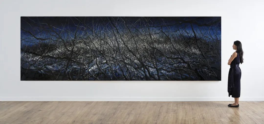 曾梵志《无题09-1-5》尺幅超五米,全景式展开密郁丛生的深邃风景,是艺术家迈入二十一世纪后全新创作阶段的重要作品,本次首登拍场。画作表面的“乱笔”苍劲有力,肆意延伸,粉色的光源从间隙中透出,神秘之中更添一丝希冀。