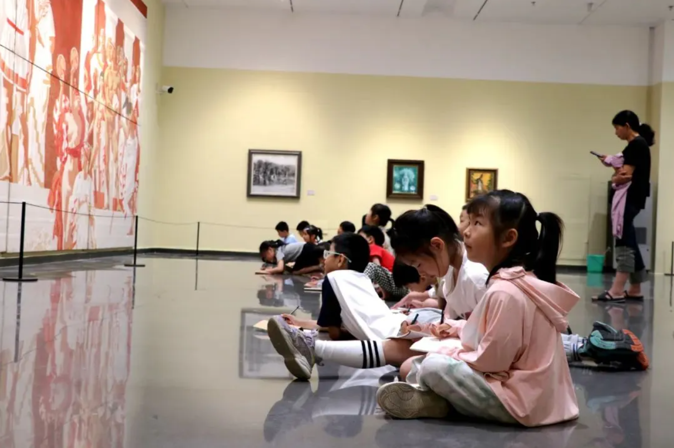 同期开放的“北国的田园诗”专题展厅中,小朋友们参观后在油画前席地而坐,并在美术老师的指导下进行临摹创作。该展厅通过展现19到20世纪俄罗斯绘画艺术发展的黄金时期部分重要艺术家的作品,并以探索绘画本体语言和其所呈现的家国情怀与民族精神为宗旨,让观众充分感受来自俄国传统油画与素描作品历经百年的深厚艺术魅力以及厚重的历史积淀与文化成就。