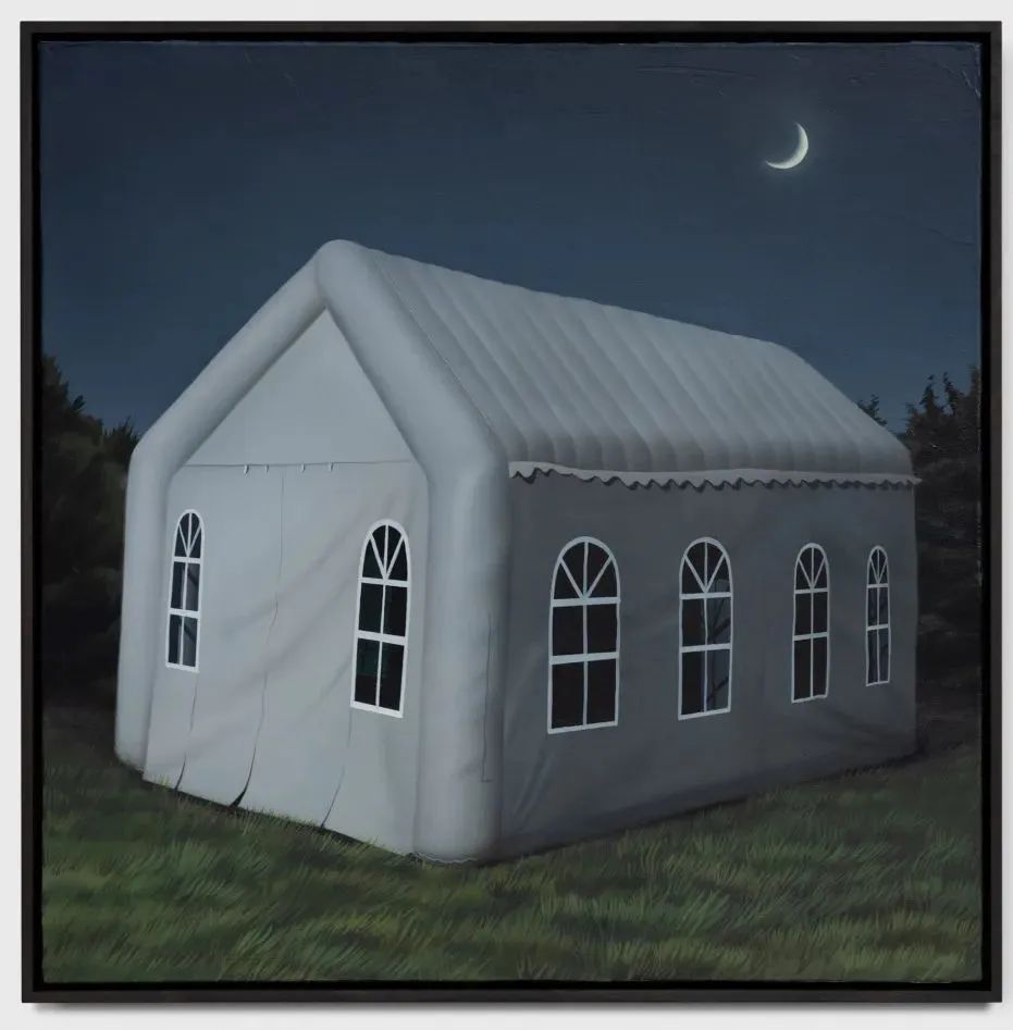 孙一钿的《世界矮了7厘米》(2019)和《无题(月光手袋)》(2022)则展现了对性别问题的持续关注。《世界矮了7厘米》中,一双闪亮的红色高跟鞋如纪念碑般尊严独立;《无题(月光手袋)》则描绘了一只顶天立地、日月同辉的女性手袋,提手化作蜿蜒长辫,背景是山峦与月光。这些原属消费社会规训机制的物品,在她的画笔下获得新意义:通过色彩的微妙调度与形态的精准转化,它们成为女性主体性的象征。福柯所言的“反抗点”——权力结构中的抵抗空间——在此获得视觉呈现。女性用品不再是被凝视的客体,而成为自我认同的显影。这种转化非口号式宣言,而是通过物的艺术再定义实现,构成她独特的美学政治立场。