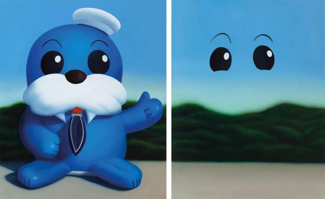 在社会关系层面,孙一钿的作品与布鲁诺·拉图尔(Bruno Latour)的“行动者网络理论”形成深层对话。画中的物不再是静止的客体,而是情感网络中的积极行动者。玩具的光滑表面、塑料的弯曲曲线,均在重构人与物的关系。这既非拜物,也非功能主义,而是一种物我共融的新状态,类似梅亚苏(Quentin Meillassoux)在《有限性之后》中设想的“前康德式物性”:物不再是主体的对立面,而是关系的共同建构者。这一理念在孙一钿2020年的双联画系列中尤为明显:每组第一幅是充气动物(如海狮、狮子),第二幅则仅剩悬浮的黑色眼睛。本应被观看的物,反过来凝视观者,主客体彻底翻转,形成既令人不安又妙趣横生的观看体验。