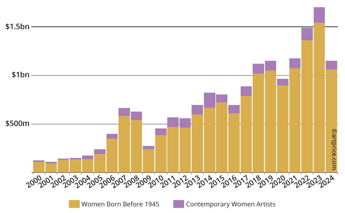 2021 年,法国国家博物馆的参考资料中显示,仅有 4%至 6%来自女性艺术家,与 19 世纪不到 2%的比例相比,进步微乎其微。策展人暨艺术评论家莫拉•赖利(Maura Reilly)在 2015 年透露,泰特现代美术馆的回顾展中只有 25%的作品是关于女性艺术家。此一发现促使纽约现代艺术博物馆和惠特尼美术馆等机构重新审视自己搜藏艺术品的政策,并组织纠正性展览。自始,女性艺术家在博物馆的地位不断壮大。拍卖行和收藏家也纷纷仿效,拍卖市场上女性艺术家有了更多的曝光机会。过去十年間,女性艺术家作品的拍卖数量成长一倍(98%),2024 年更是创下了 15,519 件作品成交的历史纪录,比 2023 年的高峰再增长了 11%,成交率不断提高,带动女性艺术家的拍卖总成交额一路上扬,最终在 2018 年突破了 10 亿美元大关。 这十年間的增长与总体市场下滑之趋势背道而驰,因此更加引人注目 。