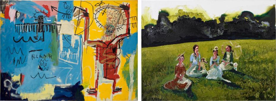 巴斯奇亚(Jean-Michel Basquiat)作品《Untitled(ELMAR)》(1982 年),图取自富艺斯 ;热尼维•菲吉斯(Genieve Figgis)作品(Ladies in the Grass,2015 年),图取自佳士得 。