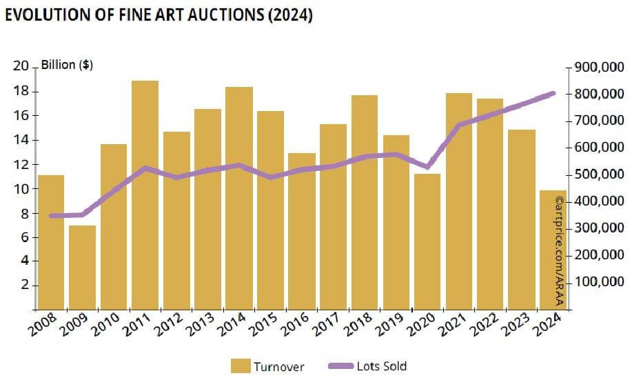 全球公开拍卖总成交额与成交数量走势(单位:十亿美元;件),图取自 Artprice。