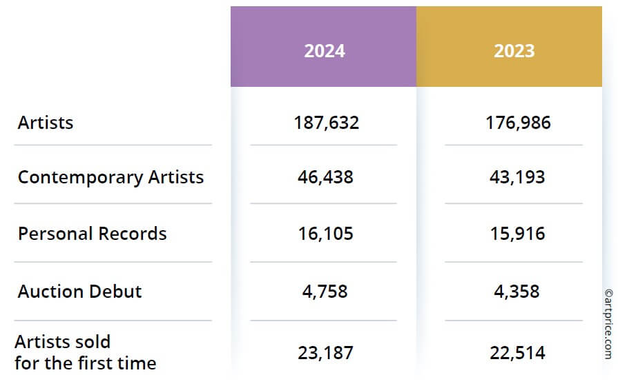 由全球艺术市场交易量创下新高来看,尽管高端市场显著放缓,艺术市场发展仍比以往更加活跃与多元。2024 年拍卖市场的艺术家数量突破 18.7 万大关,比 2023 年增加了 6%,更多不同年代、不同背景的艺术家进入拍卖市场,为艺术市场注入新的成长动能。其中看到更多 1945 年后出生的艺术家进入二级市场,Artprice 指出,当代艺术新人占拍卖市场新入场者的四分之一。整体而言,首次上拍、首次成交的艺术家皆同步成长,艺术市场作品越来越丰富多元之下,带动更多艺术家创下市场个人纪录。
