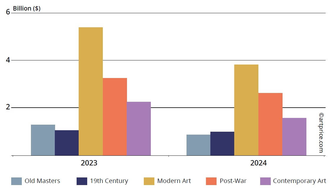 按创作时期划分的全球拍卖总成交额分布(2024 年 VS 2023 年),图取自 Artprice。
