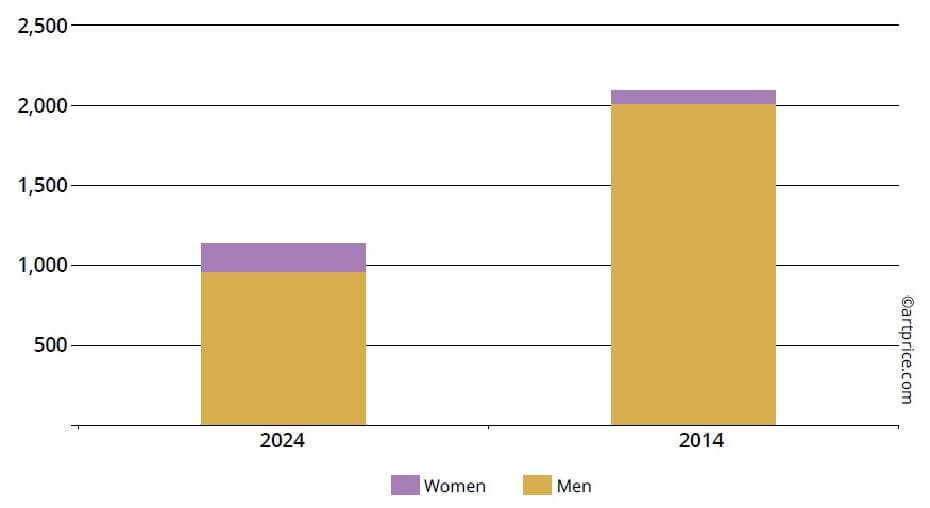 按性别分列的百万美元级拍卖成交额(2014 年对比 2024 年),图取自 Artprice。