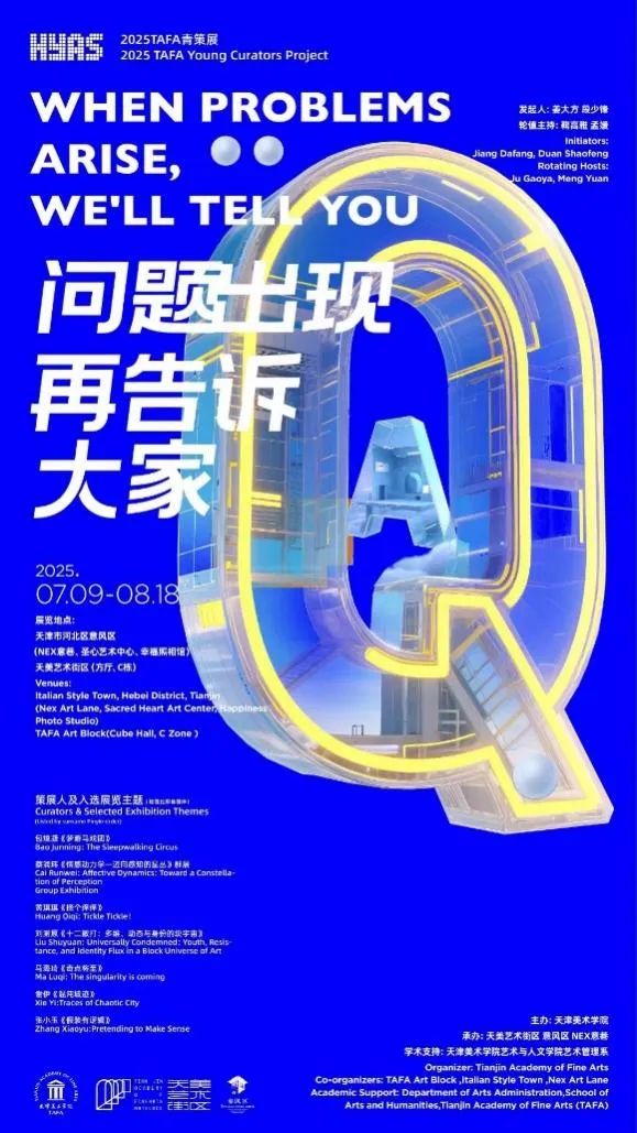 与“TAFA发现展”不同,“TAFA青策展”则是基于教学成果的转化实践,以“问题出现再告诉大家”为主题,集结七位年轻策展人,以“问题意识”为切口发起一场关于艺术与社会的深度思辨。七场平行展览分布在天美艺术街区、意风区圣心艺术中心(圣心堂旧址)、意风区幸福照相馆(民族路36号)、意风区NEX意巷(原意大利兵营旧址)等多个展区,如同七种棱镜,折射出青年群体对时代的敏锐洞察,从对数字时代亲密关系的重构,到对AI与人类边界的哲学叩问,再到超现实精神疗愈场域。这些展览拒绝单向输出,而是以“问题”为支点,在现实中寻找答案。