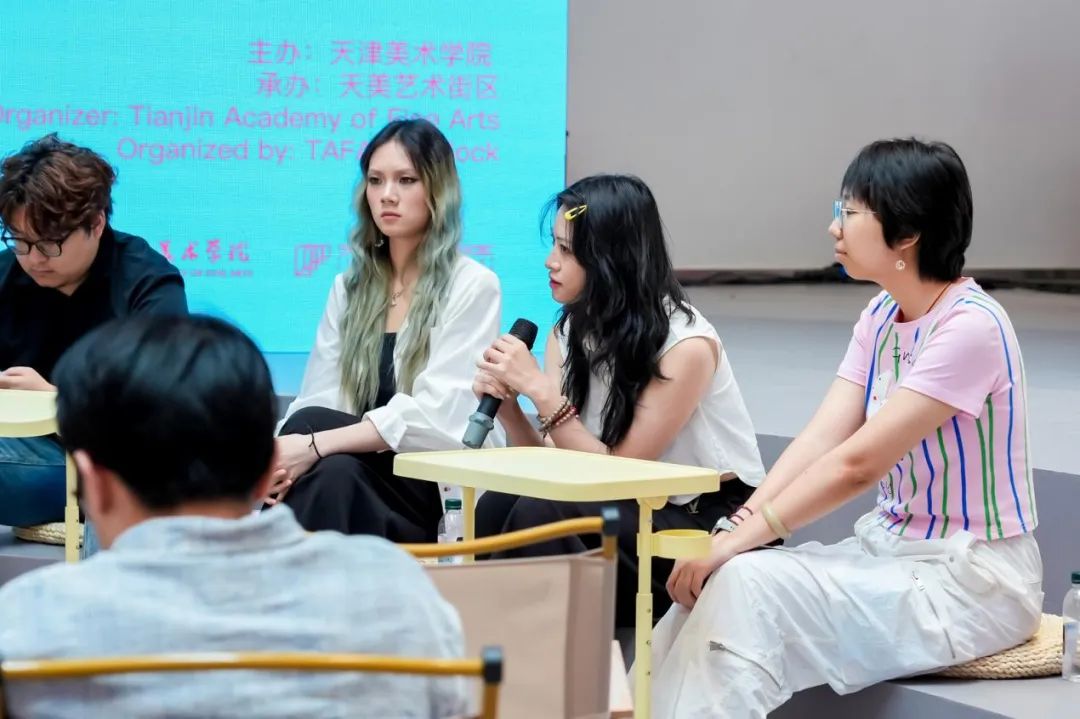 中央美术学院陈明强老师,分享了近年来一系列实验性绘画创作经验。湖北美术学院鞠腾老师则系统性介绍了“艺术计划COS-J艺术计划”,展现了其在地性的社会介入式艺术探索。四川美术学院刘影老师则分享了西南地区青年艺术家的实践经验。天津美术学院王觅老师以天津美术学院近年来建设社会美育工作站和天美夜校为例,深入探讨了天津美术学院在社会美育与城市更新领域的实践与探索。策展人段少锋老师和张钊瀛老师分别从海河青年艺术季的策划、当代公共艺术和绘画等多个维度,分享了各自的实践与创作心得。TAFA发现展的两位青年策展人,来自天津美术学院的研究生纪孟辰和王子玥就本次展览的策展过程与大家进行了深入的交流。