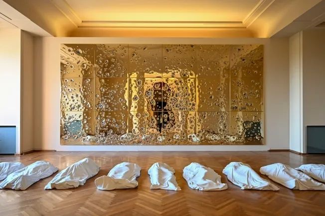 2024年的新作《礼拜日》(Sunday)中,镀有24K金的不锈钢板呈现出被枪弹 “改造”的结果:原本平滑的表面变得凹凸不平、千疮百孔,前面并排排列着毫无生气的尸体。