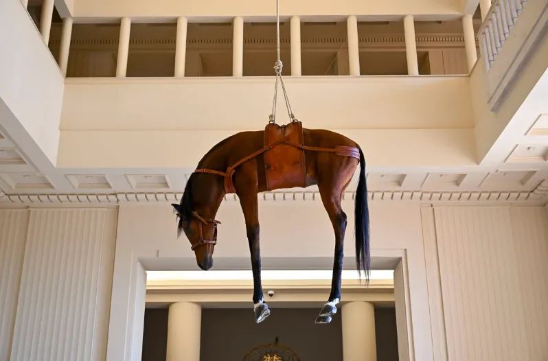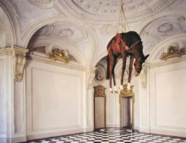 1997年的《二十世纪》(Novecento)和2007年的《无题》(Untitled),卡特兰将马匹标本吊挂起来,沉重的肉身软软地下垂,形成视觉与精神的双重冲击。