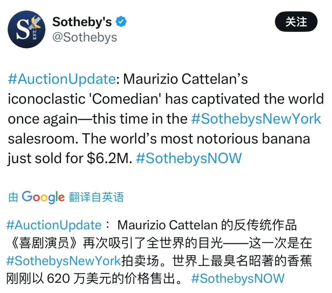 天价诞生在2016年,《他》在佳士得拍出了1719万美元,创下艺术家个人最高纪录。2024年,苏富比“NOW当代艺术晚间拍卖”中,《喜剧演员》以624万美元成交。买家是来自中国的90后收藏家、波场TRON创始人孙宇晨(Justin Sun)。他同样习惯不按套路出牌,一周后,在媒体的密密麻麻的闪光灯下吃掉了香蕉。