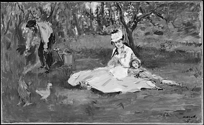 马奈却有意挑战学院派规范。还在库图尔画室当学徒期间,马奈就对模特摆出古人姿势极为愤慨,大吼“这里是巴黎”。他抵触那些陈陈相因的教学方法,反感做作僵化的艺术。他早年跟诗人、批评家波德莱尔多有交往,作品主题甚至有意借鉴波德莱尔的《恶之花》(1857),力求成为波德莱尔所说的“现代生活的画家”——寻找现代性,从流行的东西中提取诗意,从过渡中抽出永恒。在他的画中,流浪艺人、拾荒老汉、酒吧服务生这些普通人不时露面,聚会、赛马、郊游之类现代休闲生活得到速写般的记录,咖啡馆、城市街道乃至火车站等现代场景屡屡出现。他淡化人物画中的叙事性,有意抑制戏剧性效果,特别是瓦解题材的等级,重视风景和静物,将树木、花卉、椅子作为同人物一样的平等的主体。