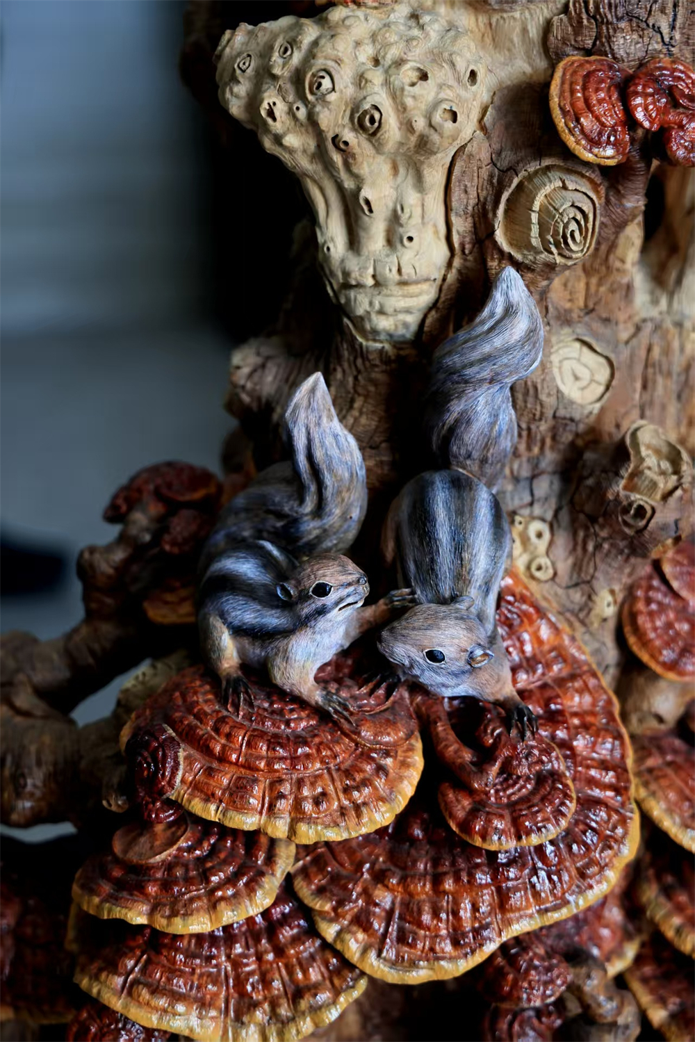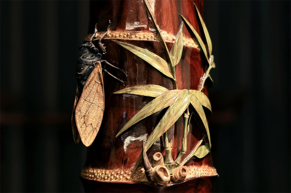 那些竹雕作品,以翠竹为骨,经匠人巧思雕琢,或成节节攀升的竹节摆件,纹理间还带着竹青的温润。而正源木雕更是令人叹服,各种老料的木质在时光里沉淀出醇厚的色泽,刀痕起落间,花鸟虫鱼栩栩如生,连羽翼的纹路、花瓣的褶皱都清晰可辨,无不感慨这方寸之间,藏着的是自然的灵韵与匠人的心血。