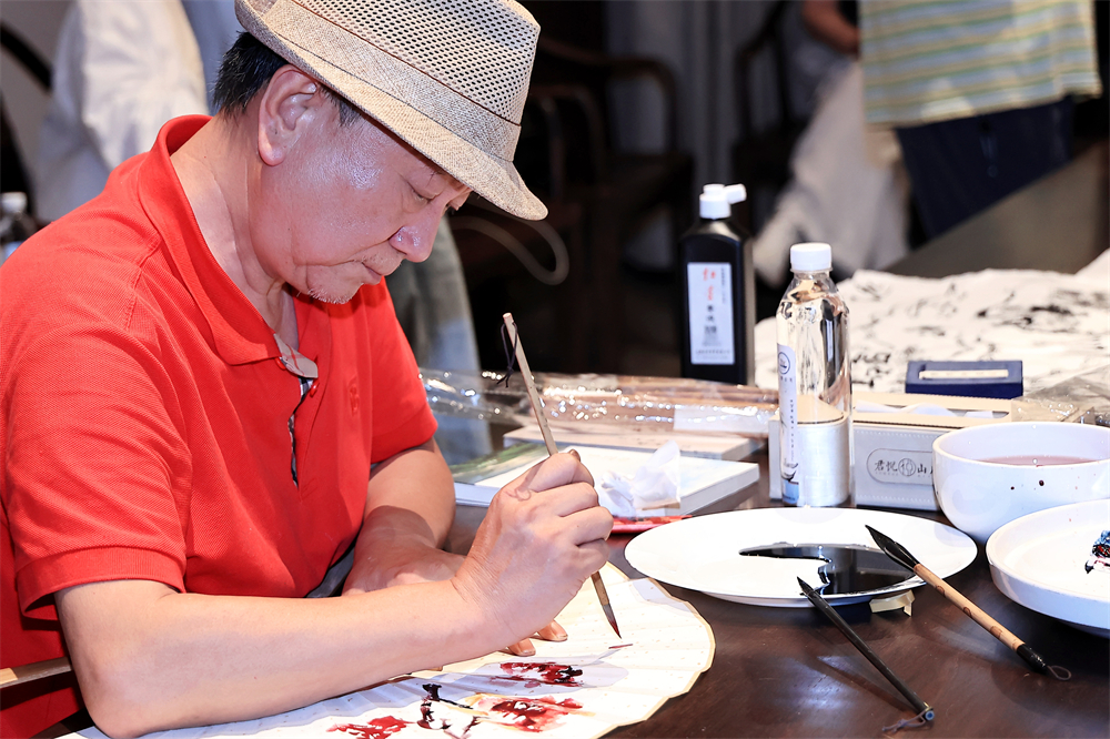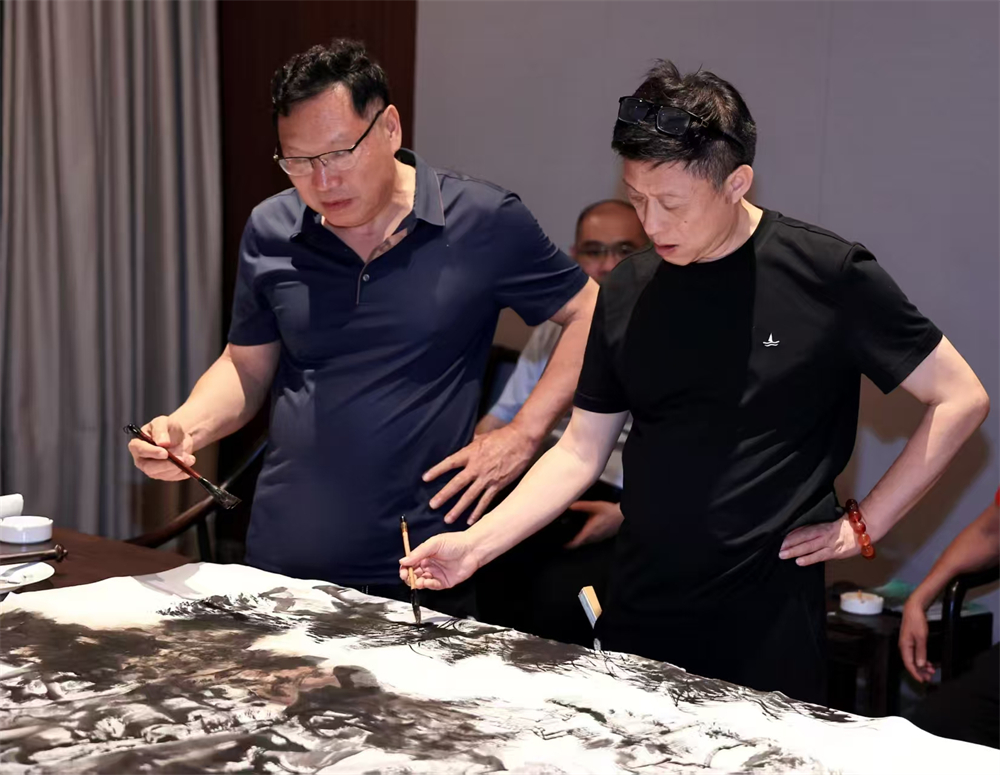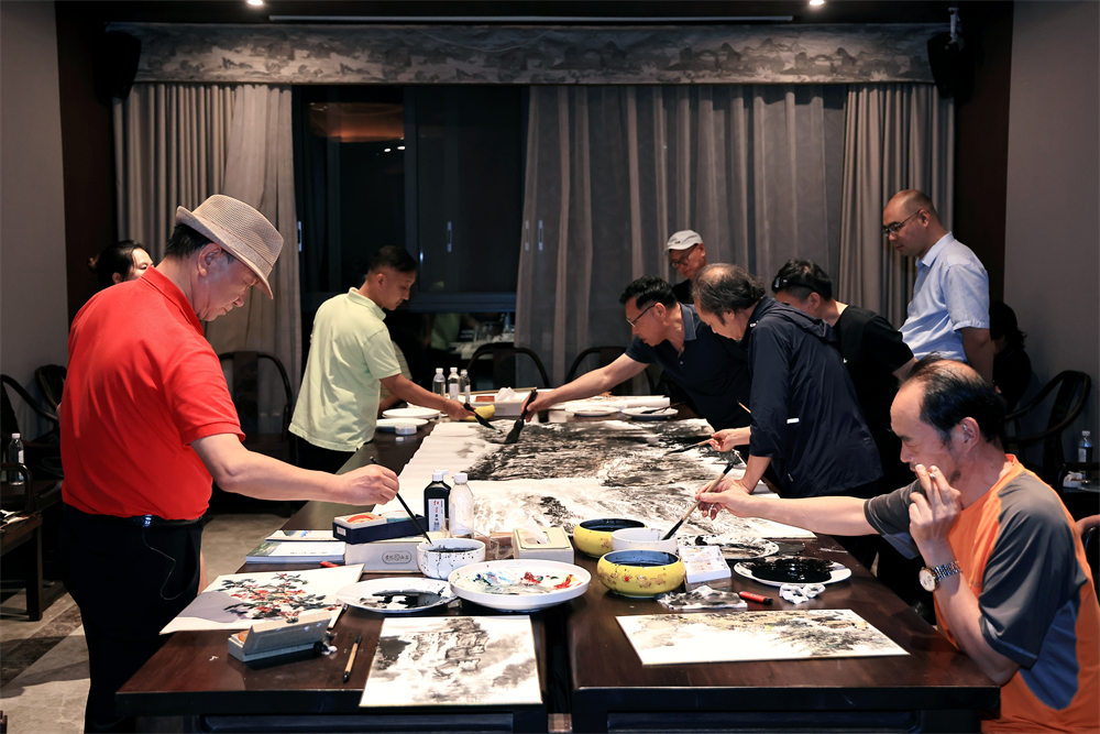墨色在纸上慢慢晕开,竹的风骨、海的浩渺渐渐成形,原本空白的宣纸,就这样被画家们注入了蜀南竹海的灵气与生机,每一笔都藏着对这片绿海的赞叹,每一幅画都是竹海之美与艺术灵感的碰撞。以笔为舟,在蜀南竹海的水墨江湖里遨游。浓墨似云瀑倾泻,晕染出竹浪翻涌的气势,当墨香与竹香在君子楼中交融,艺术家们描手执画笔,串联起自然、人文,让“无界共生”的理念在画卷上生长。
