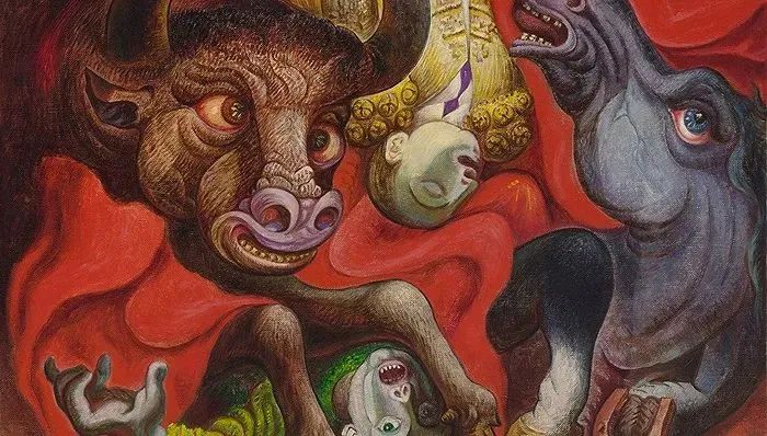 他的另一件战争题材作品,创作于1945年创作的《圣安东尼的诱惑》(The Temptation of Saint Anthony),诞生于第二次世界大战刚刚结束之际,彼时恩斯特正作为流亡者居住在美国,战争的恐怖经历给他留下了深刻的烙印。这幅画借用了沙漠中的圣安东尼抵御魔鬼诱惑的宗教题材,将其彻底转化为一个关于战争、疯狂和心理崩溃的现代寓言。