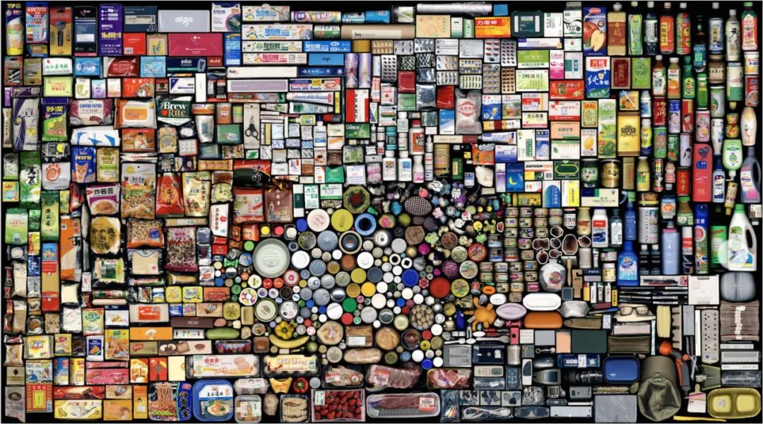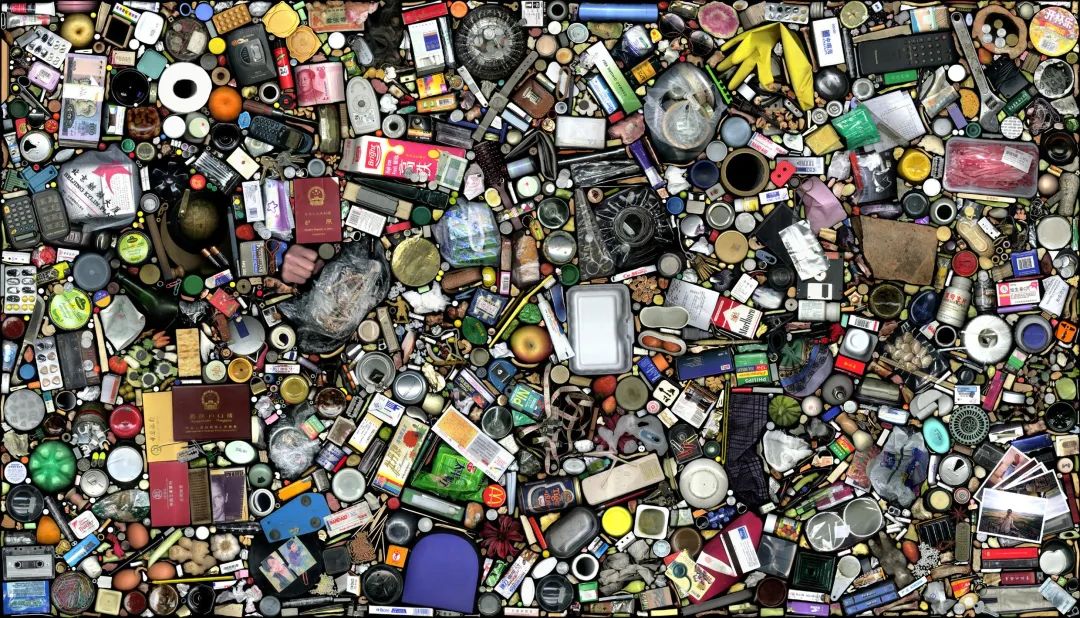 洪浩的摄影系列《我的东西》始于2001年。艺术家将自己的私人物品,通过扫描等方式组合成综合图像,创造出一种既私密又充满侵略性的独特观感。这些物品包罗万象,从平淡无奇的书本、卫生纸,到怪诞奇特的收藏,再到如护照、信件般的个人证物等等。这种对个人所有物的彻底展示,被解读为对时代症候的揭示:一个被过度物质和资本文化所裹挟的飞速发展的当代社会。