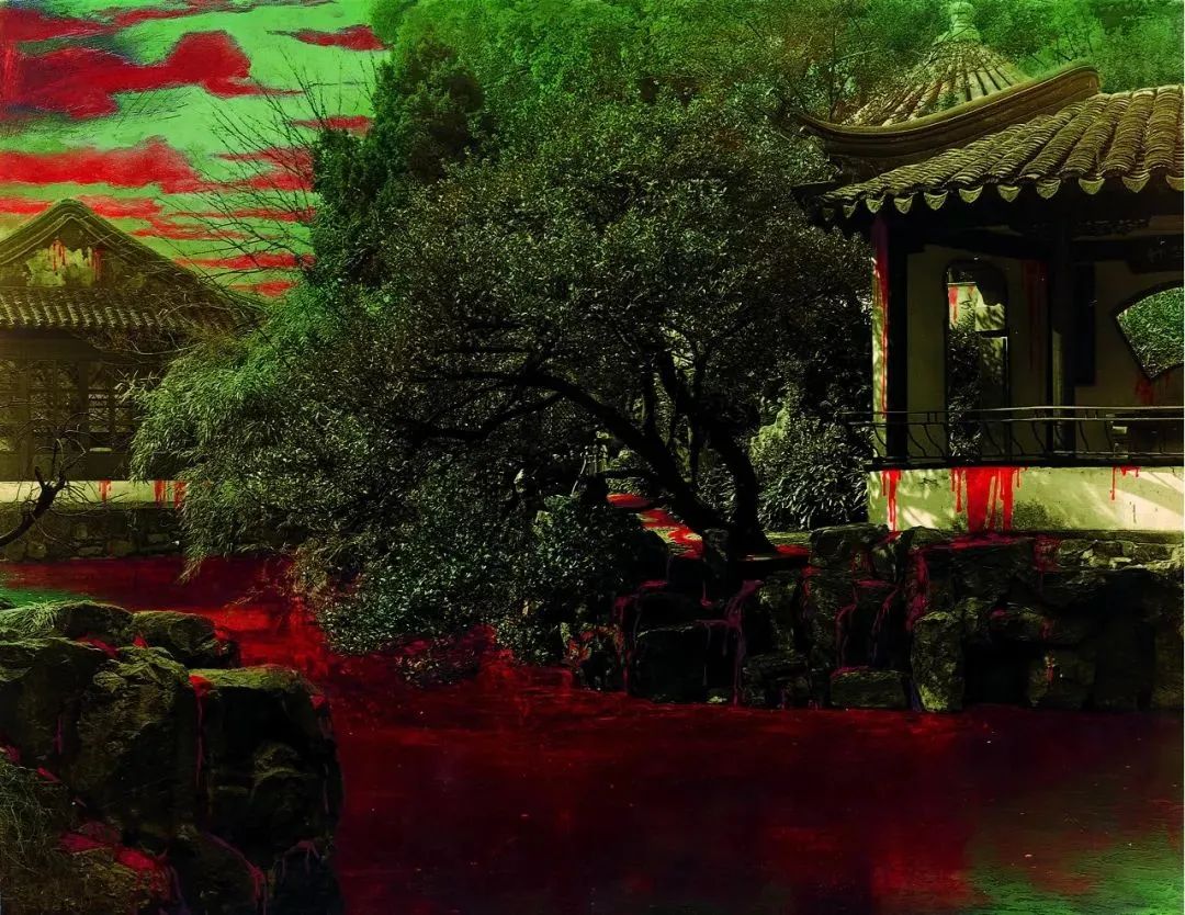 《中国风景》系列延续并发展了《紫禁城的秋天》中确立的创作方法,将批判的矛头更广泛地指向了整个中国传统文化和当代现实。这一系列作品通过在中国美术史上最经典的图像——宋代山水画,或者代表文人墨客的园林中,“植入”一些血腥、暴力、不和谐的当代元素,暗示了当代消费社会中,知识分子的“精神家园”早已被暴力、环境污染和精神危机所侵蚀。