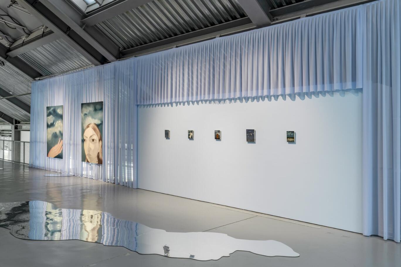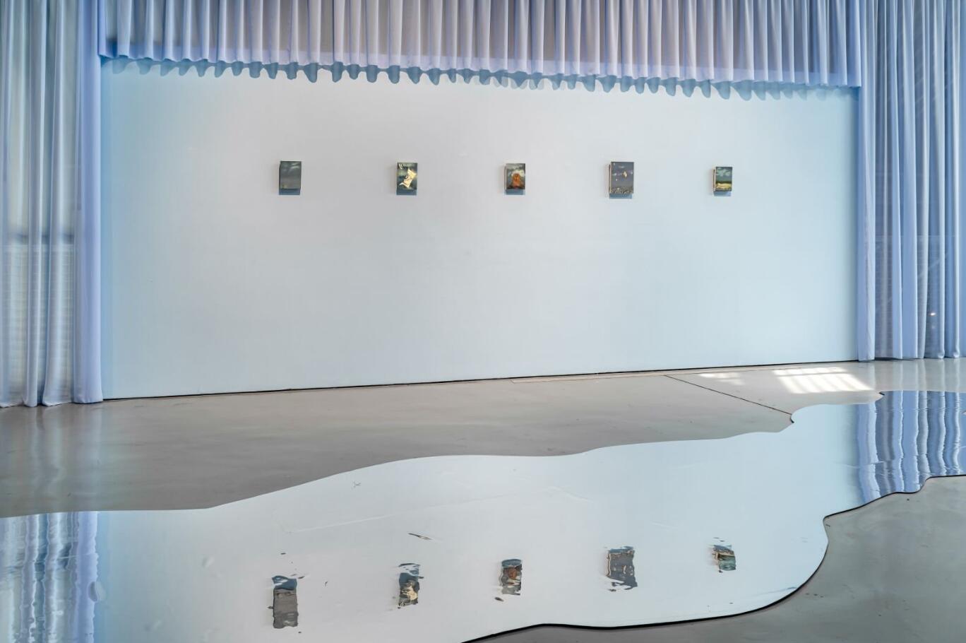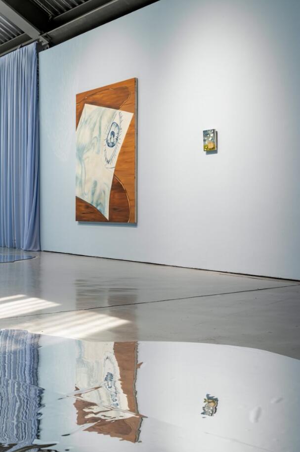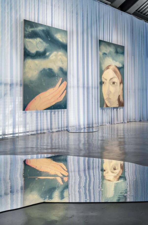 艺术家通过绘画将沉浸于水与风的感知具象化,并将这种体验延伸至展览空间。在展陈建构上,她构建了一个映射风、水、云等自然元素的场域装置:地面铺设有机形态的镜面箔片,隐喻雨后积水;画作周围垂坠的半透明蓝灰色薄纱帘,则唤起绵密雨幕的视觉记忆。