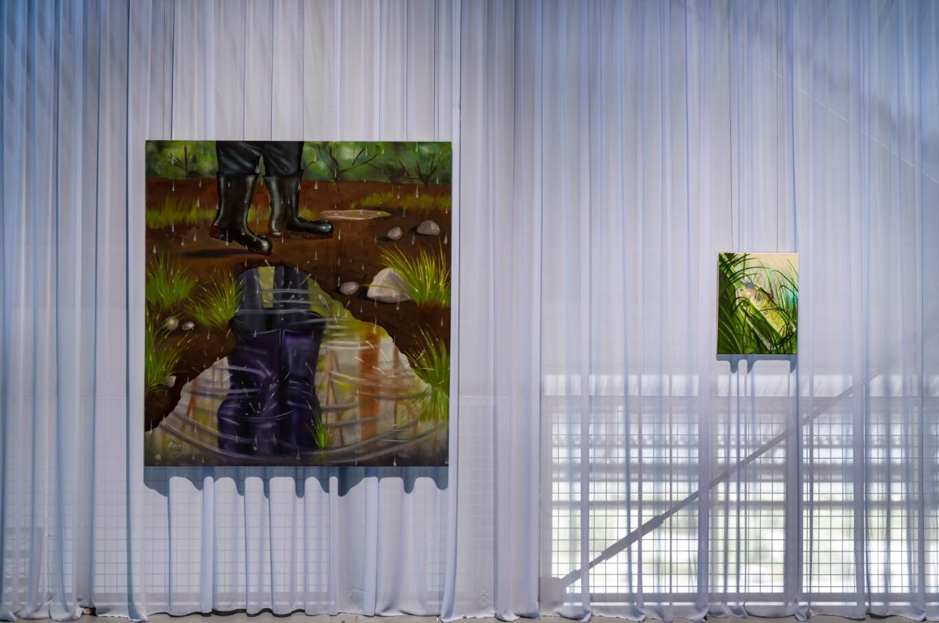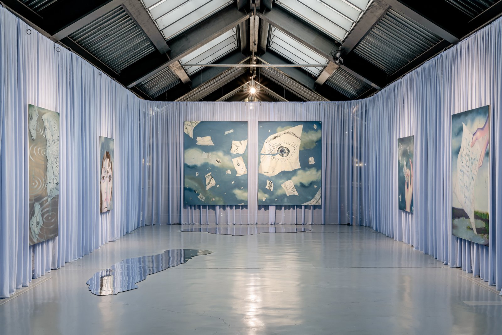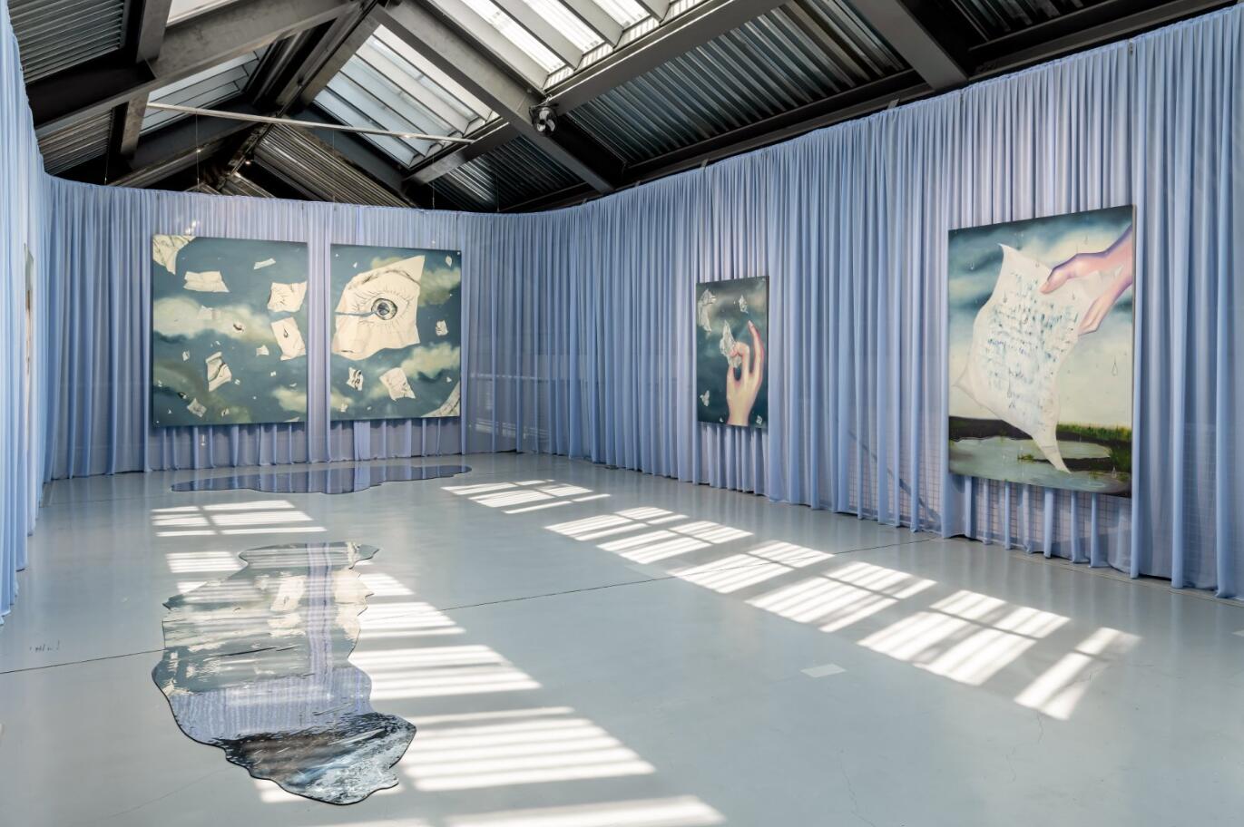 艺术家通过绘画将沉浸于水与风的感知具象化,并将这种体验延伸至展览空间。在展陈建构上,她构建了一个映射风、水、云等自然元素的场域装置:地面铺设有机形态的镜面箔片,隐喻雨后积水;画作周围垂坠的半透明蓝灰色薄纱帘,则唤起绵密雨幕的视觉记忆。