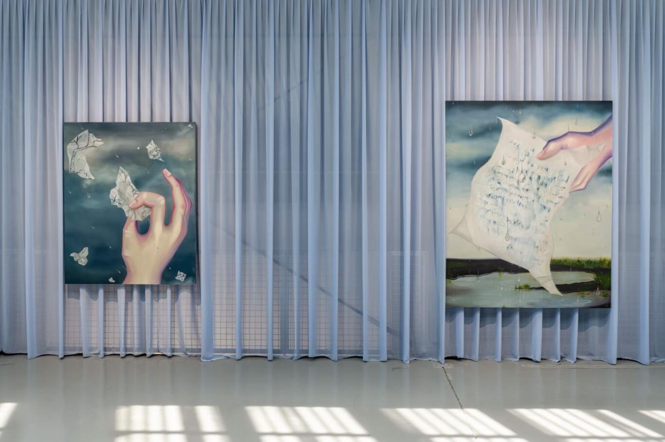 在她首次亚洲美术馆个展《风向何处》中,雅布隆斯卡特别考虑了START星美术馆特有的空间环境——自然光线充盈的宽敞展厅、变幻的光影与反射效果,以及毗邻河岸的地理位置。艺术家笔下的人物形象与周围湿润朦胧的环境相互渗透,呈现出流动的形态,将“自我”从肖像中抽离至风景后——《飞舞的素描》(2025)里震动的风裹挟着大量自画像特写的手稿在空中颤动,《占卜者的来信》(2025)中通灵者眼中的“我”被雨水打湿的模糊不堪,《雨滴》(2025)中标志性的肖像需要透过雨水的变形而显现······观众只能从被撕裂的信息中拼凑和想象那个个体和真相。相较于艺术家早前创作的一系列色彩浓艳、视觉强烈的大尺幅肖像,该展览中的作品更显轻盈、诗意、灵动且隐晦。作品在一定程度上削弱了对现实的对抗性和危险性,进而更指向情感的内化和自我的存在性表达。
