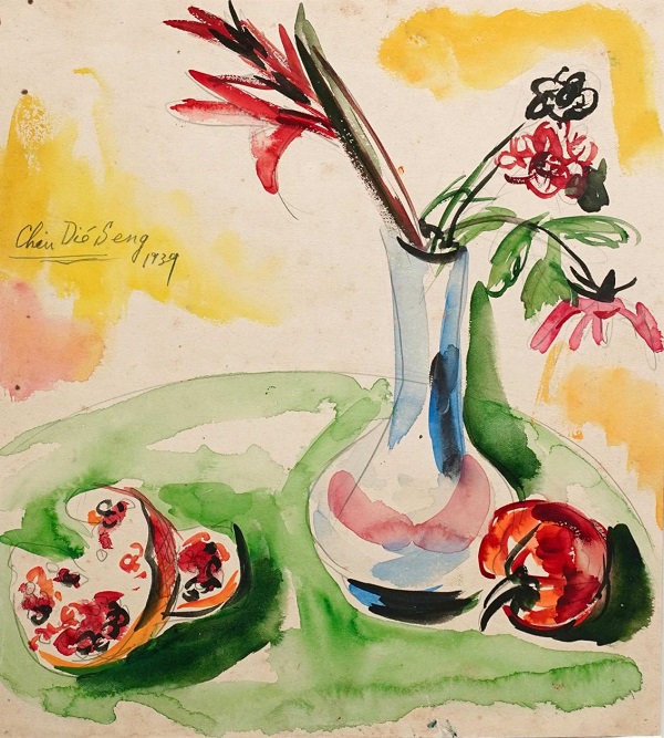 静物与石榴(杭州艺专抗日时期作品),1939,纸本水彩,54 x 38cm
