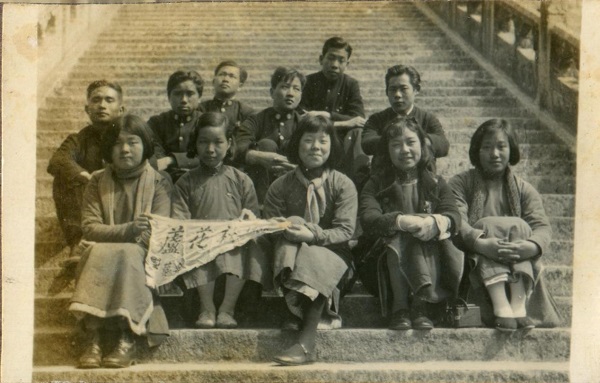 1936年 许铁生和杭州国立艺专的芦花社的成员门在杭州绍兴禹王庙台阶前留影(后排左三为许铁生,后排右一为年轻的赵无极)
