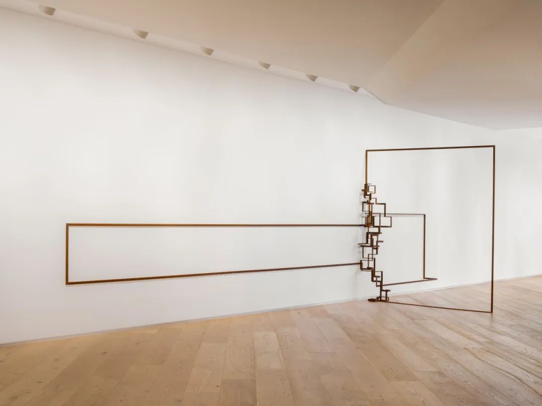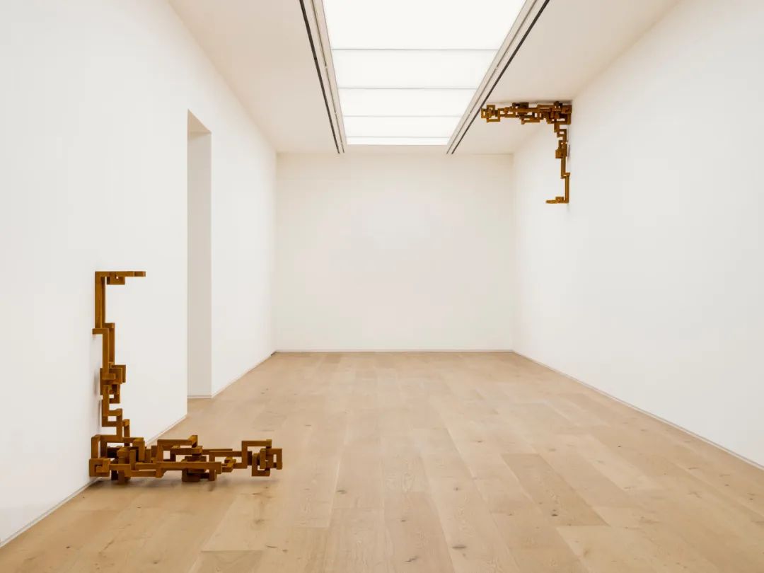 位于下层展厅的“绳结作品”(Knotworks)则绘制身体与空间的关系图谱,令人联想到如管道、电路与交通网络等支撑建成世界的连接性基础设施,从而将身体纳入更广泛的网络之中。呼应着葛姆雷的重要装置作品《测试一种世界观》(Testing a World View,1993),展出的每件雕塑均贴合于地板、墙壁或天花板之上。