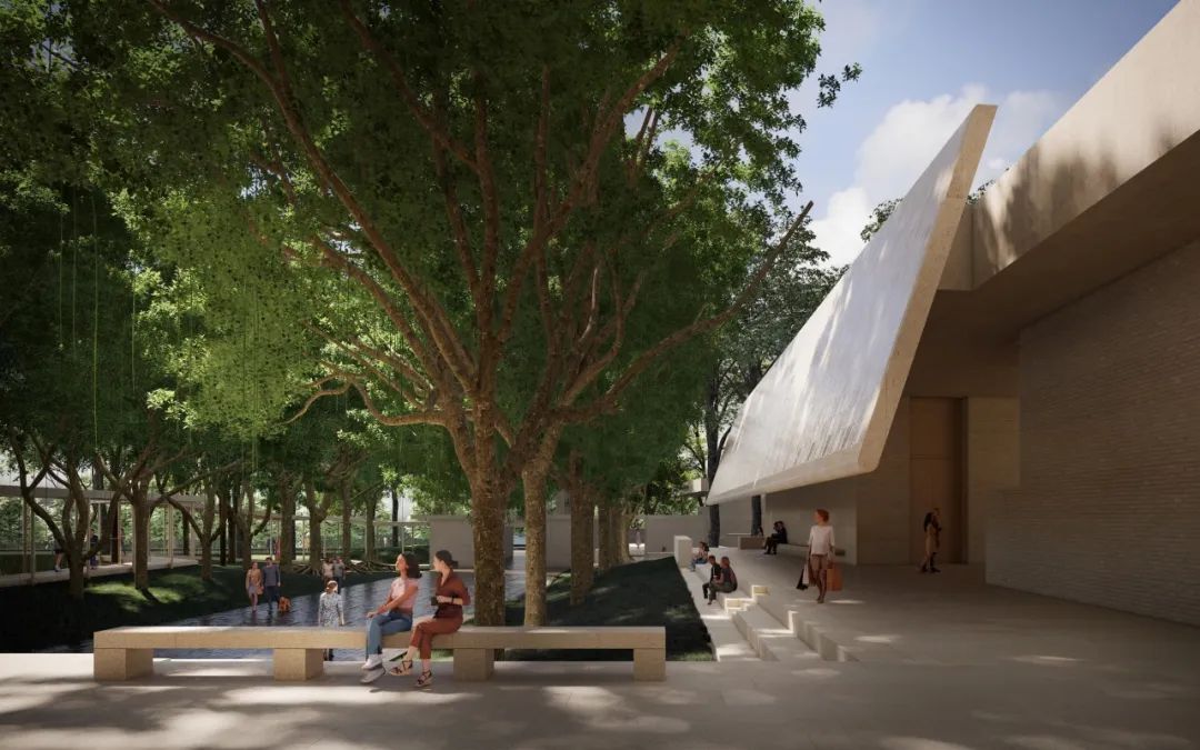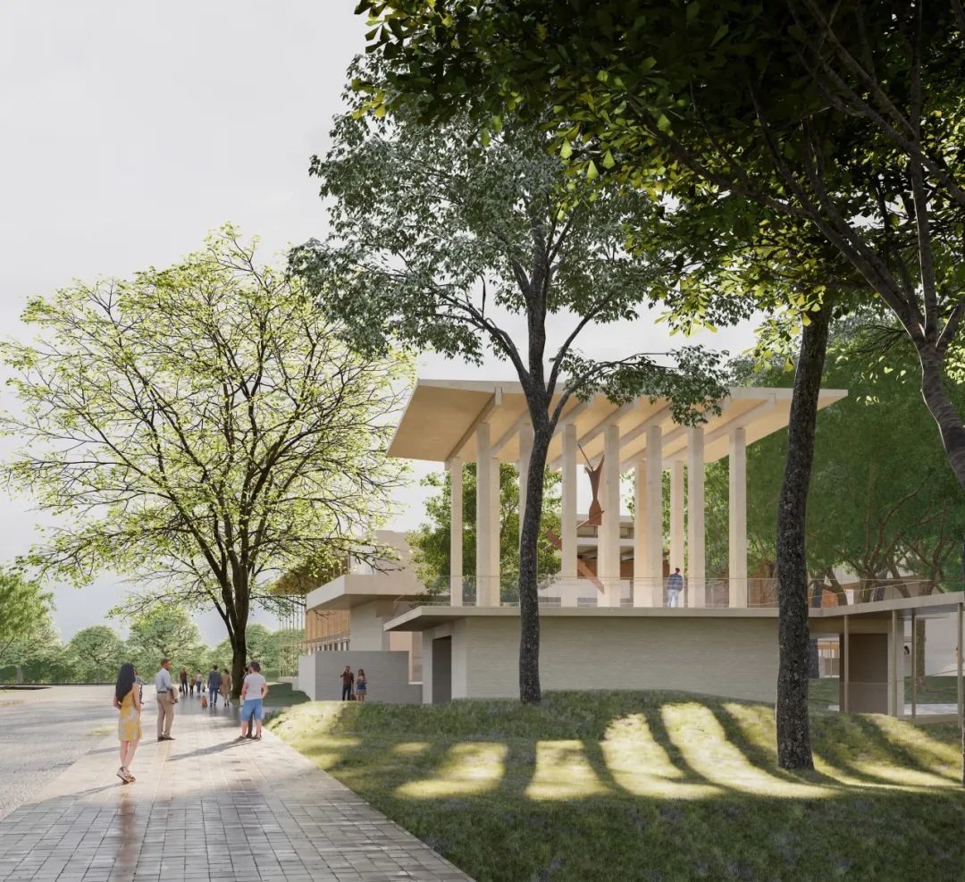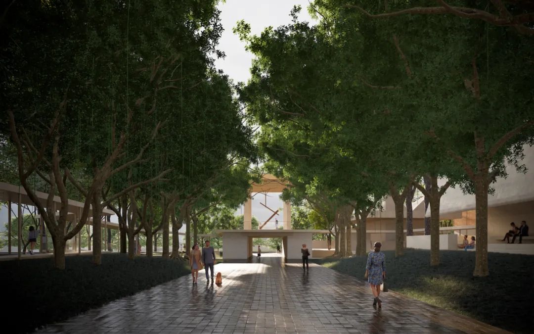 场地中由榕树构成的林荫大道,以及秋枫与南洋楹掩映下起伏的微地形景观,是建筑设计回应的核心要素。25棵大榕树形成了一条50米长、贯穿场地的绿色天蓬。