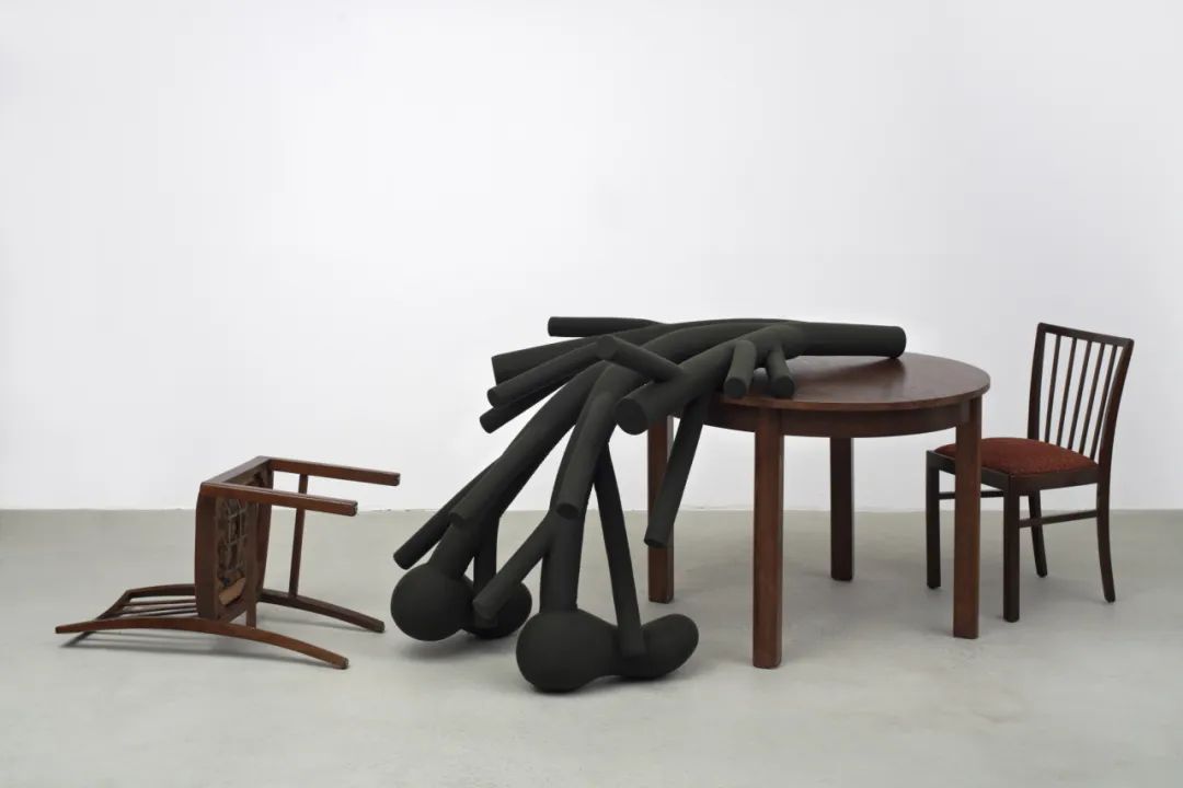 西姆的关注不止于物本身,而是指向物与人的共构关系。在她精心设计的家庭场景中,生活被悄然拆解并重组,“物”与“身体”彼此渗透:家具长出四肢,厨房器物与家庭空间静止如舞台布景,暗示着被排演的规则。其中的“人物”沉默、失衡、错位却又栩栩如生,唤起观众对熟悉环境的警觉与疏离,日常生活随之转化为显现权力结构的场域。艺术家以此强调身体是被文化制度塑形的工具,揭示了日常劳动与性别分工在社会秩序中长期被塑造与维系的现实。