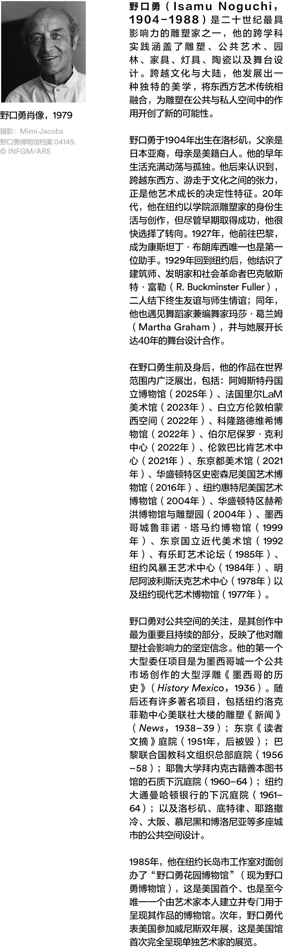 同期,日裔美籍著名艺术家野口勇(Isamu Noguchi)的雕塑作品将在美术馆的“戏台”空间展出。