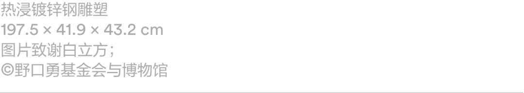 作为二十世纪最具影响力的艺术家之一,野口勇晚年将日本传统纸艺的形式与工业金属的制造工艺相结合,创作出一系列镀锌钢雕塑,此次展出的作品便是其中之一。这件雕塑以抽象回应了瑞士艺术家贾科梅蒂雕塑中标志性的纤长人体造型,在自然与人造、轻与重、柔与刚的张力中,展现了野口勇跨越东西方的独特艺术视野。