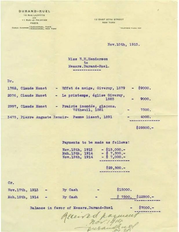 E. H. Henderson于杜兰德·鲁埃尔画廊购买此作的收据,1913年11月10日