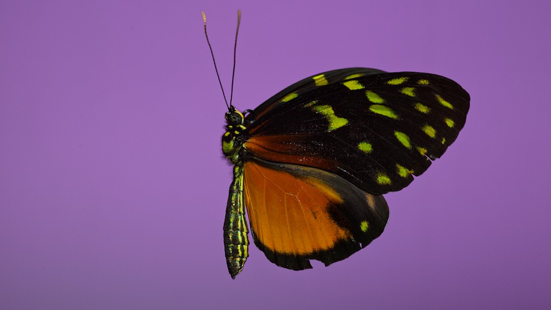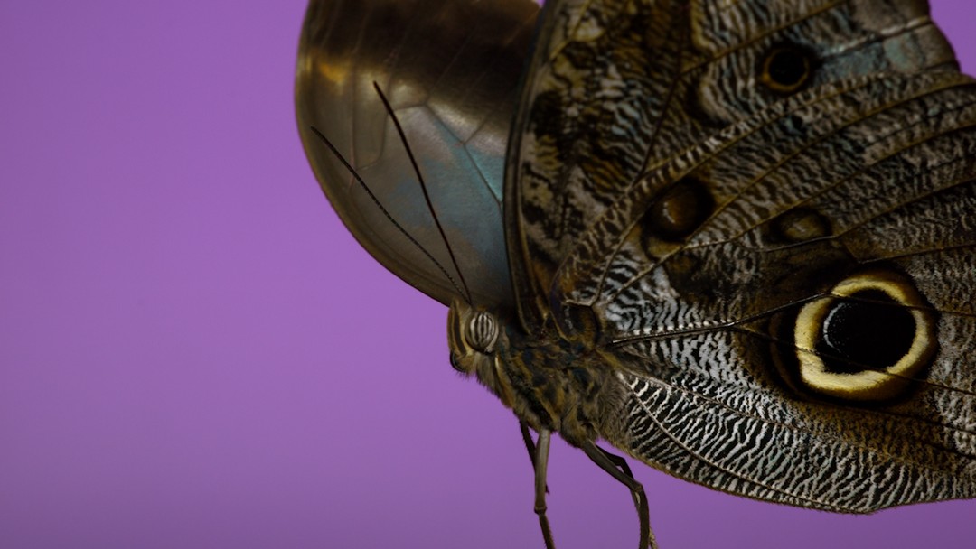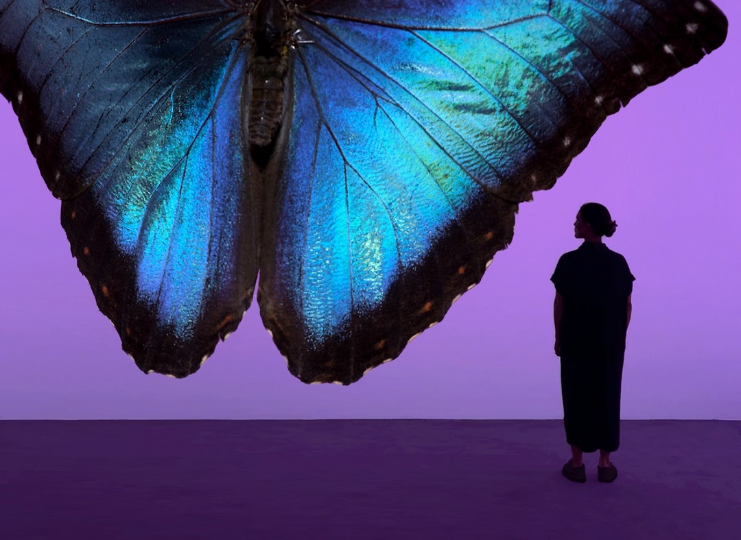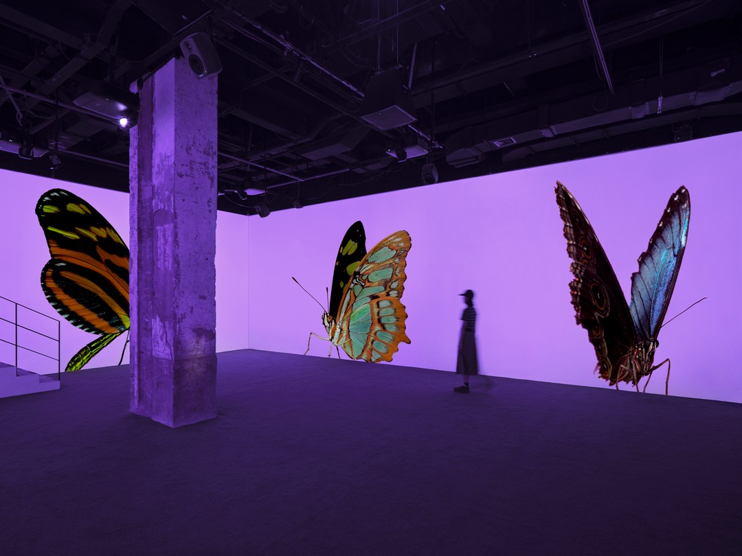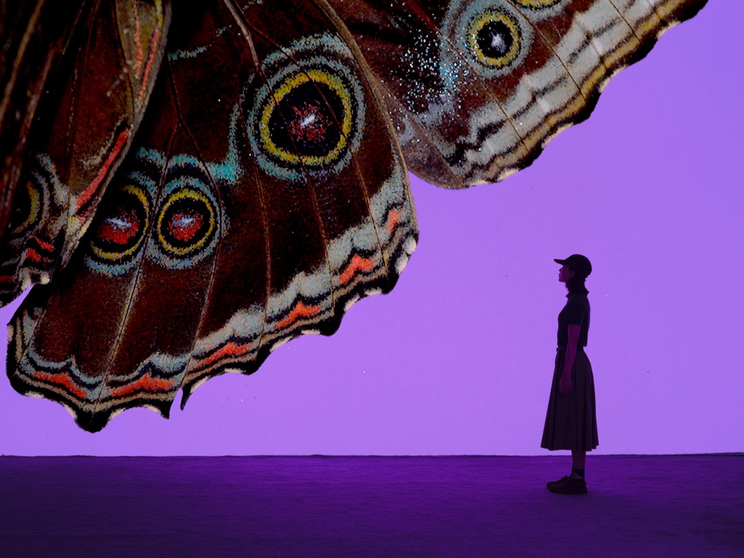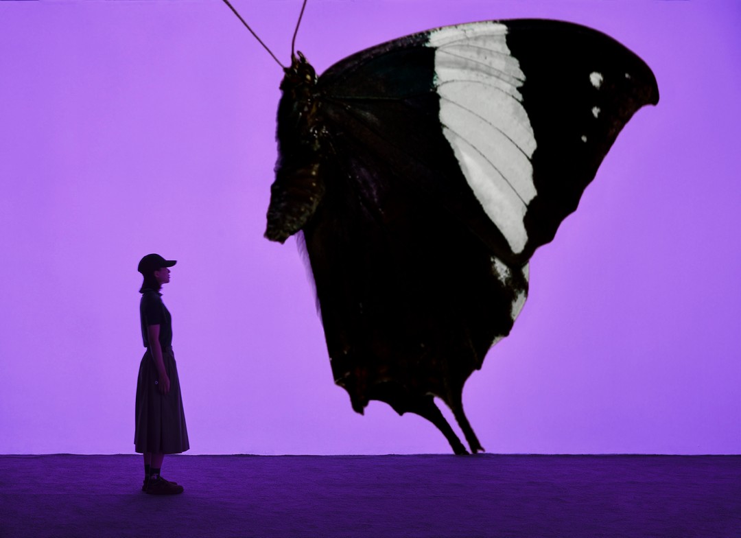 加尔瓦尼的艺术实践始终扎根于对自然与人类生存境况的探索,并游走于艺术与科学的边界。在此次最新影像创作中,艺术家运用每秒可捕捉百万帧的超慢动作摄影技术,将二十种濒危蝴蝶仅数周的短暂生命周期,精确延展至人类尺度的73年。通过这种对时间的精密拉伸,蝴蝶的生命被赋予人类的时间感知,它们振翅的瞬间被拉伸为恢弘的视觉史诗,鳞翅的颤动、破损的羽翼、脱落的与闪光鳞片,在发光的紫色宇宙中化为时间的具象符号。在投影构筑的另一个时间的平行宇宙中,观众得以亲历慢速流淌的影像中生命的脆弱与坚韧,体验一场跨越物种界限的沉浸式哲学对话——用分钟丈量一秒钟的坠落,凝视鳞片脱落的慢速轨迹,或聆听翅膀划破空气的无声频率,展览悄然模糊了生命与虚无、刹那与永恒的边界。