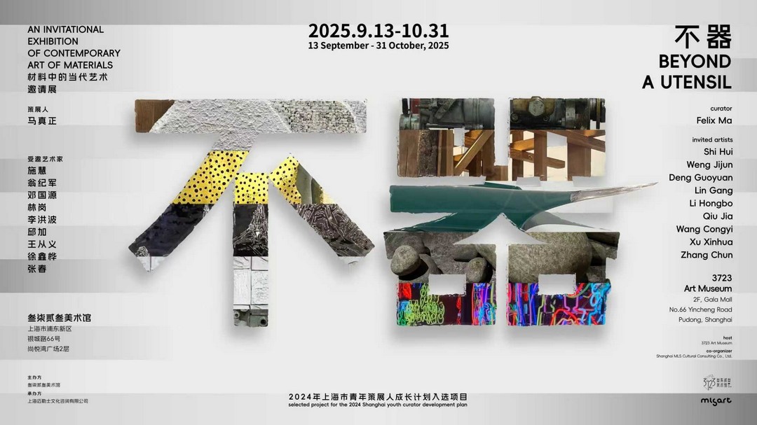 “不器——材料中的当代艺术创作邀请展”于 2025年9月13日在上海叁柒贰叁美术馆正式开幕,由马真正先生担任策展人,并入选2024年上海市文旅局青年策展人成长计划。展览邀请9位在当代艺术领域耕耘多年的艺术家,集中呈现他们各自运用不同材料创作的28组作品,展期将持续至 2025年10月31日。