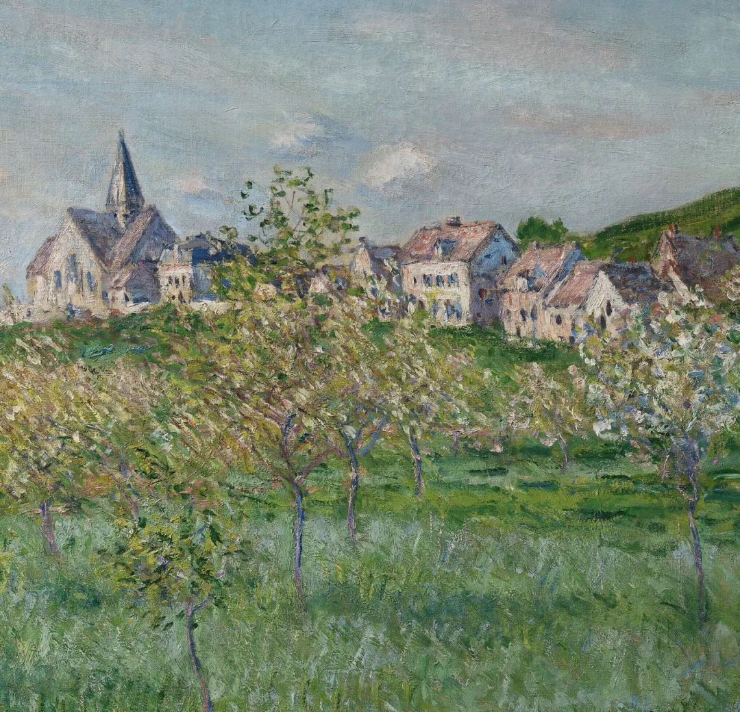 《午后光影下吉维尼的春天》标志着莫奈艺术新章的开启,初现其系列创作与同时绘制多幅画作的习惯。莫奈为这片果园景致绘制了两个版本,皆以向北视角眺望繁花盛放之境。